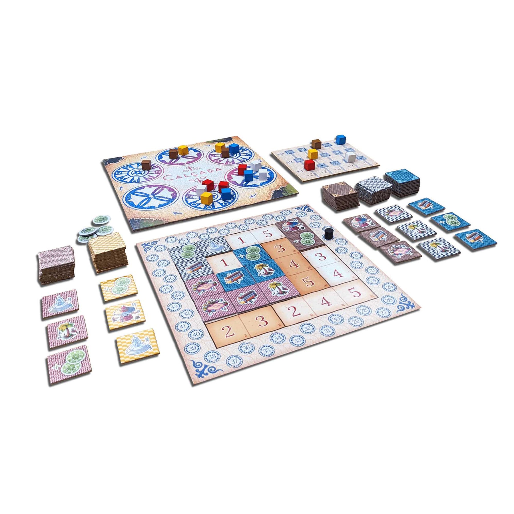 In this simple yet multifaceted strategy game for the whole family, the beautifully designed sidewalks of Portugal take center stage. Simple in its gameplay but packed with ingenious details, the winner of this creative tile-laying game for two to four players remains undecided until the very end. The colorful game essentially consists of two quick-to-learn steps: "Announcing & Pushing" followed by "Placement of Calçada Tiles.