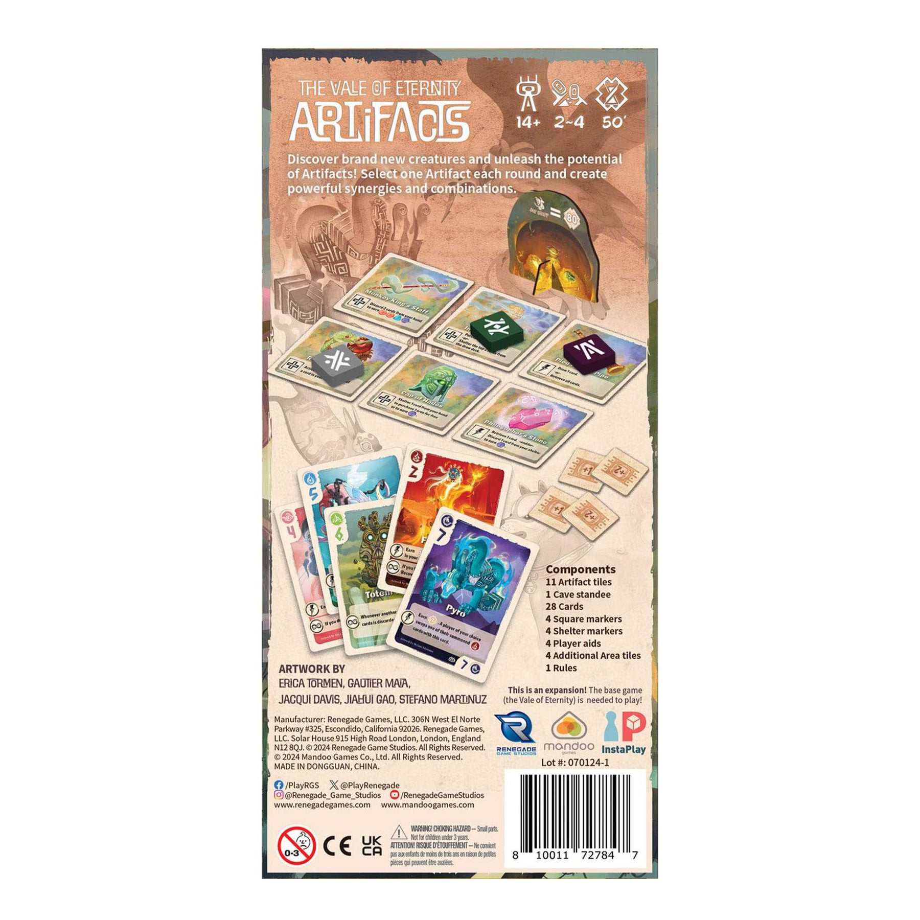 Discover amazing new creatures and unleash the potential of Artifacts! Select one Artifact each round and create powerful synergies and combinations. The Vale of Eternity: Artifacts, an expansion for The Vale of Eternity, adds 28 creature cards with new effects to the deck, as well as artifacts that players draft during the hunting phase at the start of each round.