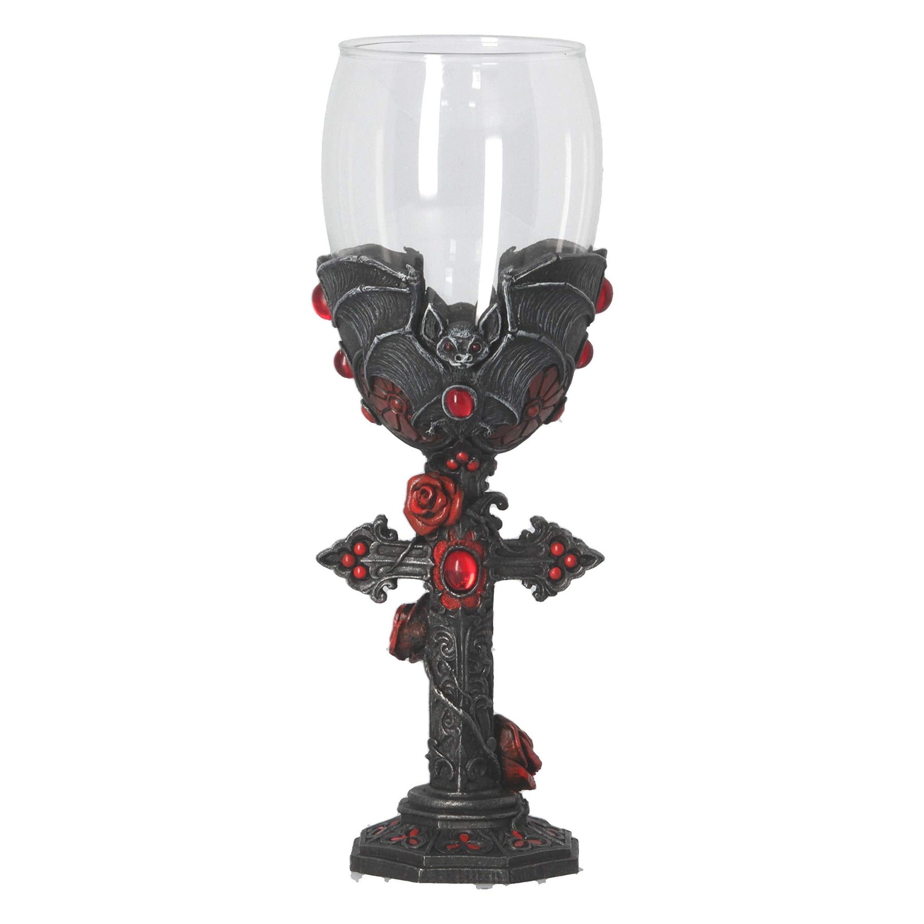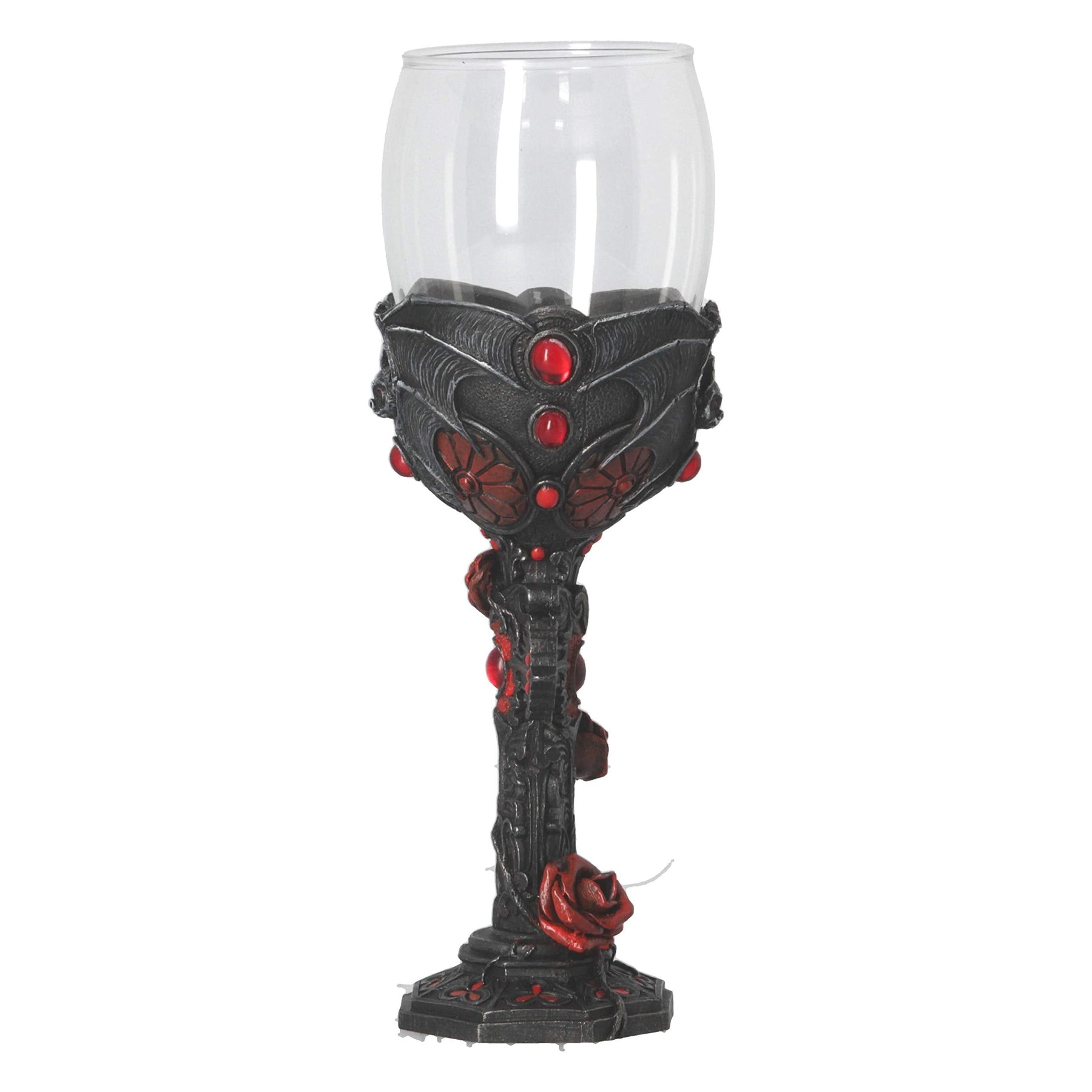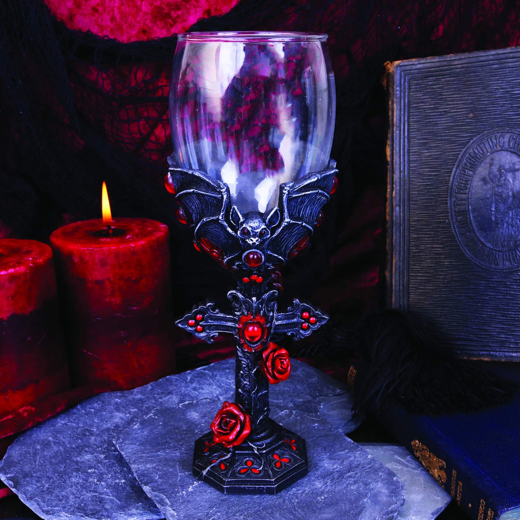 This Gothic Wine Glass was created by Horror masters Nemesis Now. A pair of menacing bats curve around the glass cup, holding it into place. The wing structure can be clearly seen on the bats, with raised bones and textured membrane, adding dimension to the piece. Between the tips of the wings at the side of the cup, four red stones sit, adding to the Gothic Charm. The stem is formed from an ornate cross, encapsulated by an intricate network of red Roses. Cast in the finest resin before being expertly hand-painted, this goblet is perfect for any Dracula enthusiast.