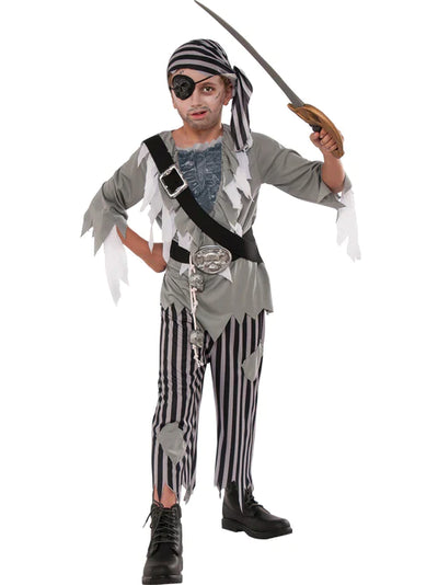 Oh no! After spending centuries haunting the seven seas, this bloodcurdling Ghost Pirate has stepped upon land to haunt your Halloween celebration! With trousers, top, bandana and all the accessories a ghastly apparition needs, this costume is the perfect choice for however you plan to celebrate the spookiest night of the year.
