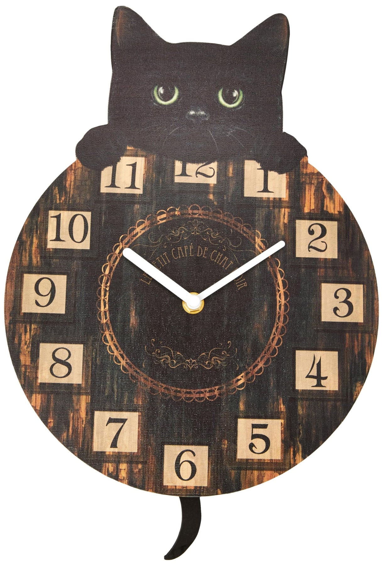 Designed by their own fantastic in-house artists, this adorable wall clock is from alternative brand Nemesis Now's giftware collection. The face of the clock is a wooden disc, similar to an honest wooden dining table. Over the top, a curious black kitten peers at you with curious green eyes, ears erect and alert. Below the clock, the kitten's tail hangs down and swings as the clock's pendulum. Around the centre of the clock face is the phrase 'le petit cafe de chat noir', or 'the small cafe of the black cat'. Perfect for adding a touch of charm to any kitchen or breakfast nook, this wall clock is a great gift for any cat lover.