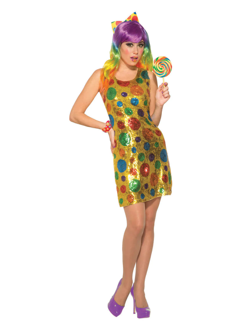 This gorgeous Clown Polka Dot Sequin Dress Costume is perfect for any lady looking to dress as a comical Clown! This fantastic costume comes complete with a Multicoloured, Polka Dot Sequin Dress which is a must-have for any Clown costume wannabe!