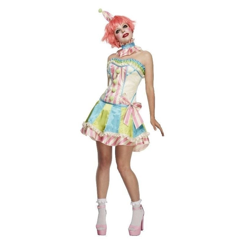 - Fever Deluxe Vintage Clown Costume, White, Corset, Skirt, Attached Underskirt, Collar and Hat