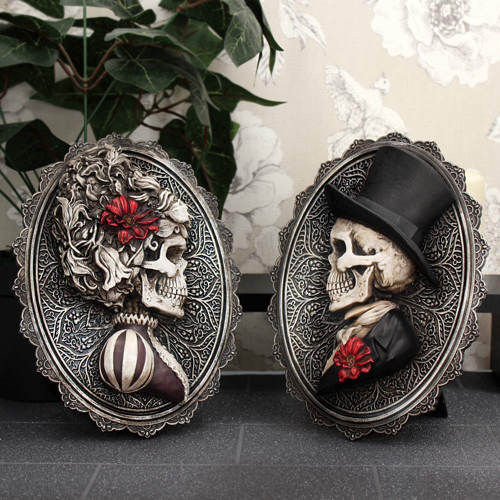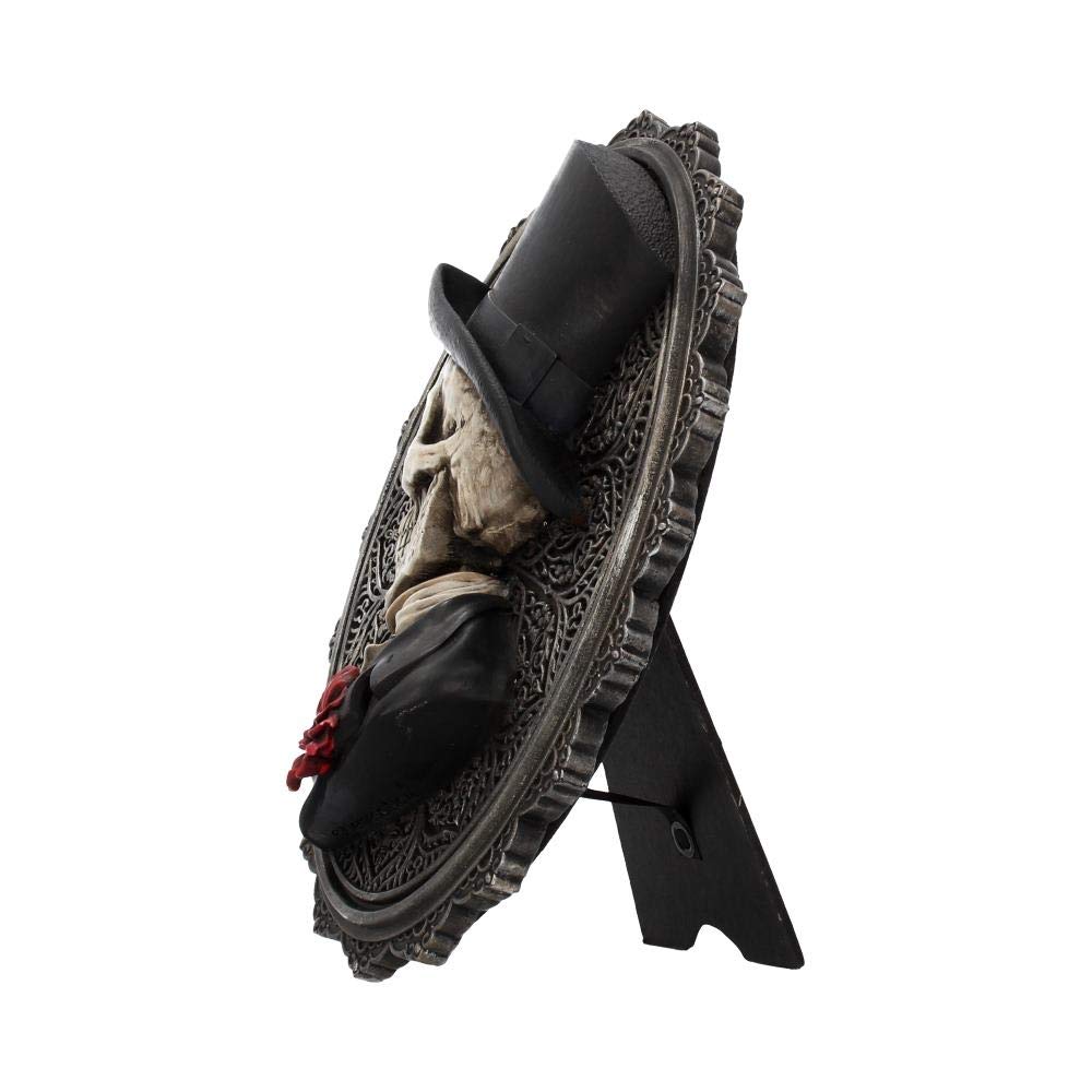 This handsome skeletal portrait comes from the imaginations of Nemesis Now's own design team. Facing left, this skeleton wears a tuxedo with a black top hat. A red rose adorns his buttonhole in front of his white bow tie. Behind him, the oval plaque is covered in ornate patterns resembling thistles, with a scalloped border to the frame. Cast in high-quality resin before being expertly hand-painted, this dashing skeletal portrait can either be hung as a wall plaque or stand on its own.