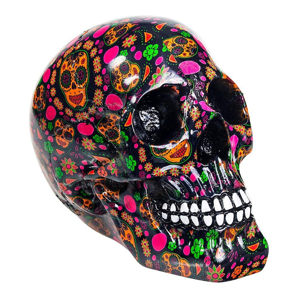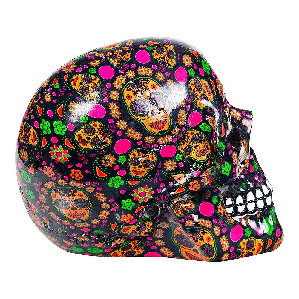 From alternative brand Nemesis Now's giftware collection, this skull would make a great addition to any Ofrenda. Sunken eye sockets and nasal aperture a deep black, this grinning skull is covered with a orange sugar skulls, fuchsia flowers and small green dots, taking inspiration from the Mexican Calavera's. Cast in high-quality resin, this skull is a fantastic way for lovers of the macabre to decorate their home.