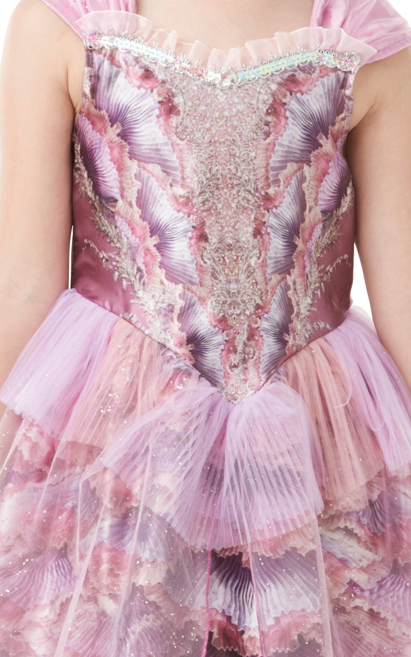 - dress With Satin Bodice Showcasing Digitally Printed Details, Glitter Embellishments, Silver Braid and Soft Tulle Frill Across Neckline With Sequin Trim