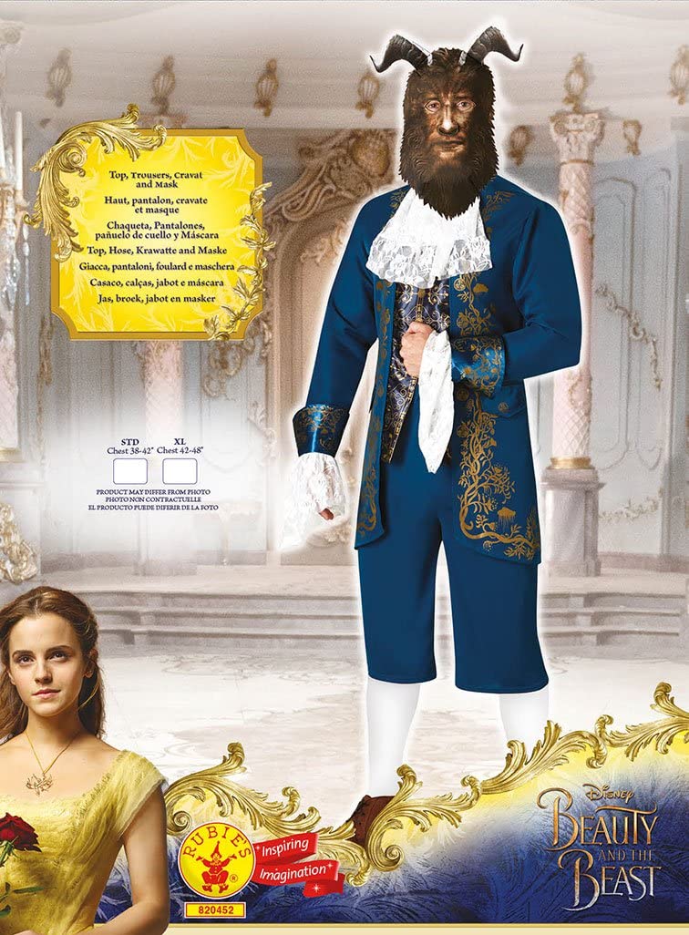 The Beast costume comes with a pair of matching blue three-quarter length trousers which feature an elasticated waistband for a comfortable fit and it's finished with a full colour print face-mask which includes the horns. So celebrate the lavish live production of Disney's Beauty and the Beast and turn your own princely look into those of a terrifying creature and hope that true love finds you before the final petal drops from the enchanted rose..