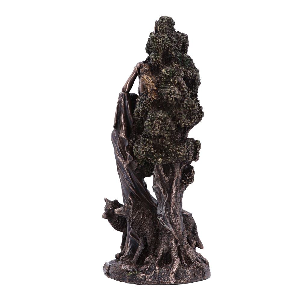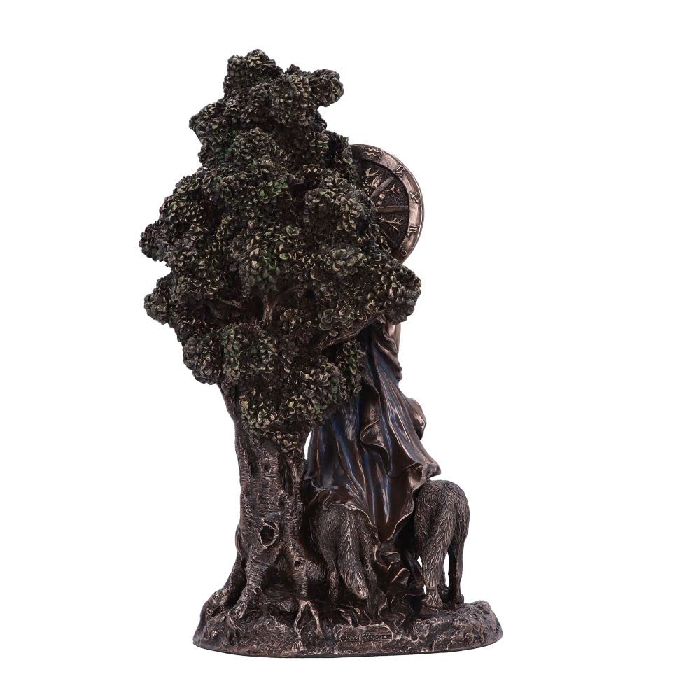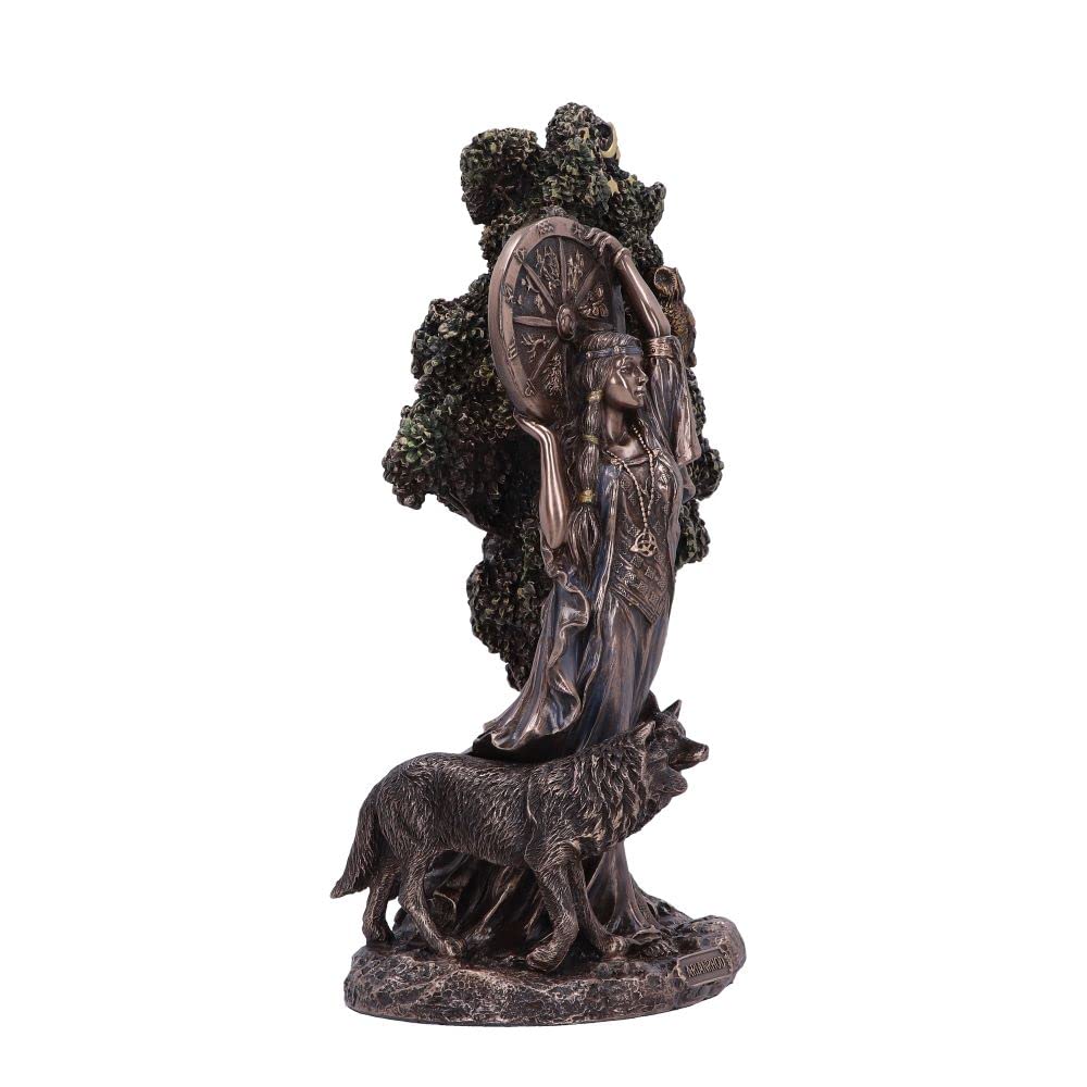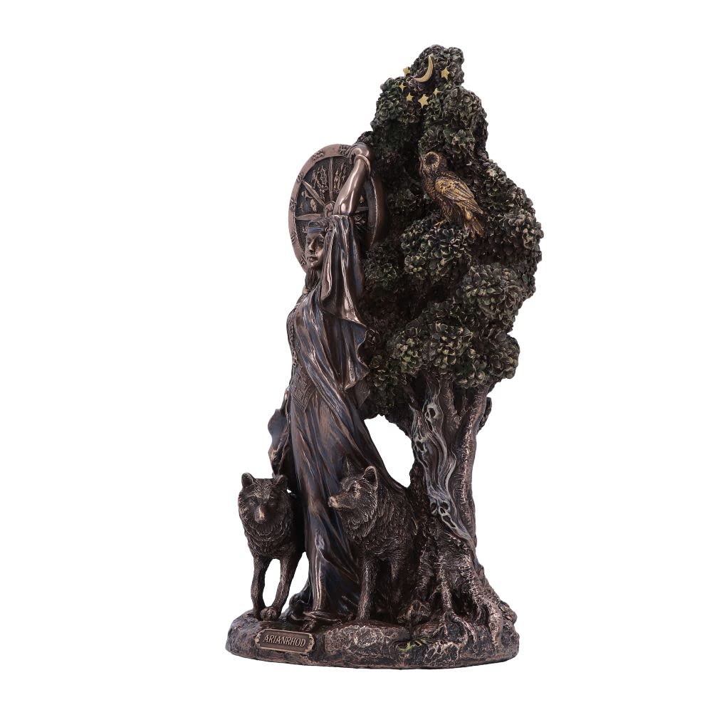 In Welsh Celtic Mythology Arianrhod is known as the Goddess of the moon, time, fate, fertility and rebirth. Her name has been translated as silver-wheel, which represents the ever-turning wheel of the year. Arianrhod is a free spirited Goddess but also has a vindictive side and is unable to forget past actions and events. She stands strong with her wolf companions at her side, surrounded by lush tree foliage. Cast in the finest resin before being expertly hand-painted and finished in bronze, this statue will make the perfect gift to any lover of mythology.