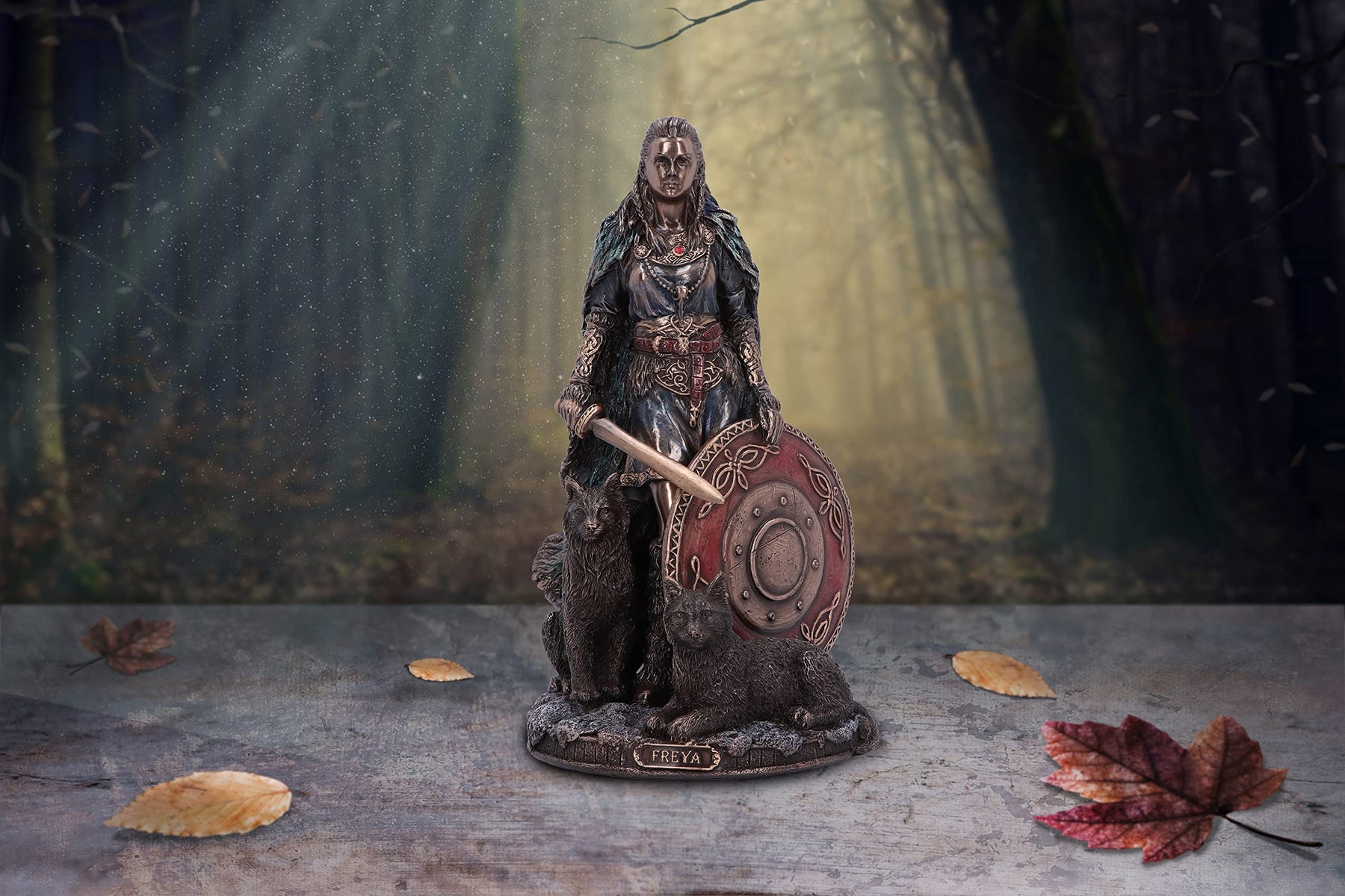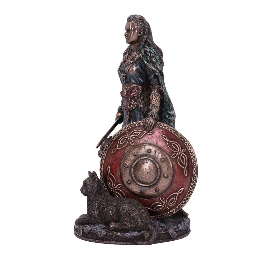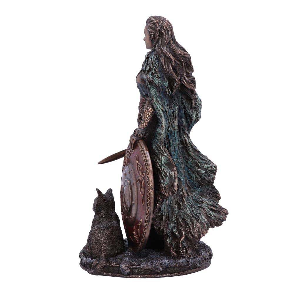 Freya is a goddess in ancient Norse mythology, most often associated with love, war and fertility. Here she can be seen with her trustee companions, ready for battle, with a sword firmly gripped in her hand and a shield resting upon her leg. Making this the perfect product for any alternative home or mythological collection.