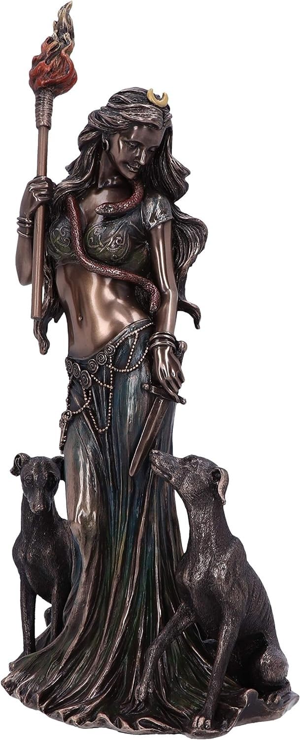 Cast in the finest resin before being given a bronzed finish, this mystical Goddess comes from alternative brand Nemesis Now's Giftware Collection. Hecate is a goddess in ancient Greek religion and mythology, most often associated with crossroads, entrance-ways, light, magic, witchcraft, knowledge of herbs and poisonous plants, ghosts, necromancy, and sorcery. Here she is depicted as a singular being holding a light torch, flanked by her dogs. Dogs were a common sacrificial animal in rites to invoke the goddess, and the sacrificed dog was often eaten, but some theories hold that Hecates dogs were actually shades or demons.