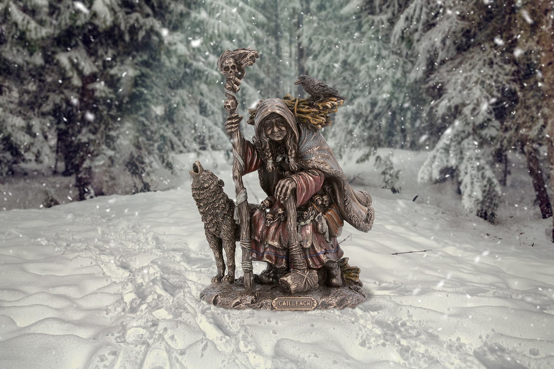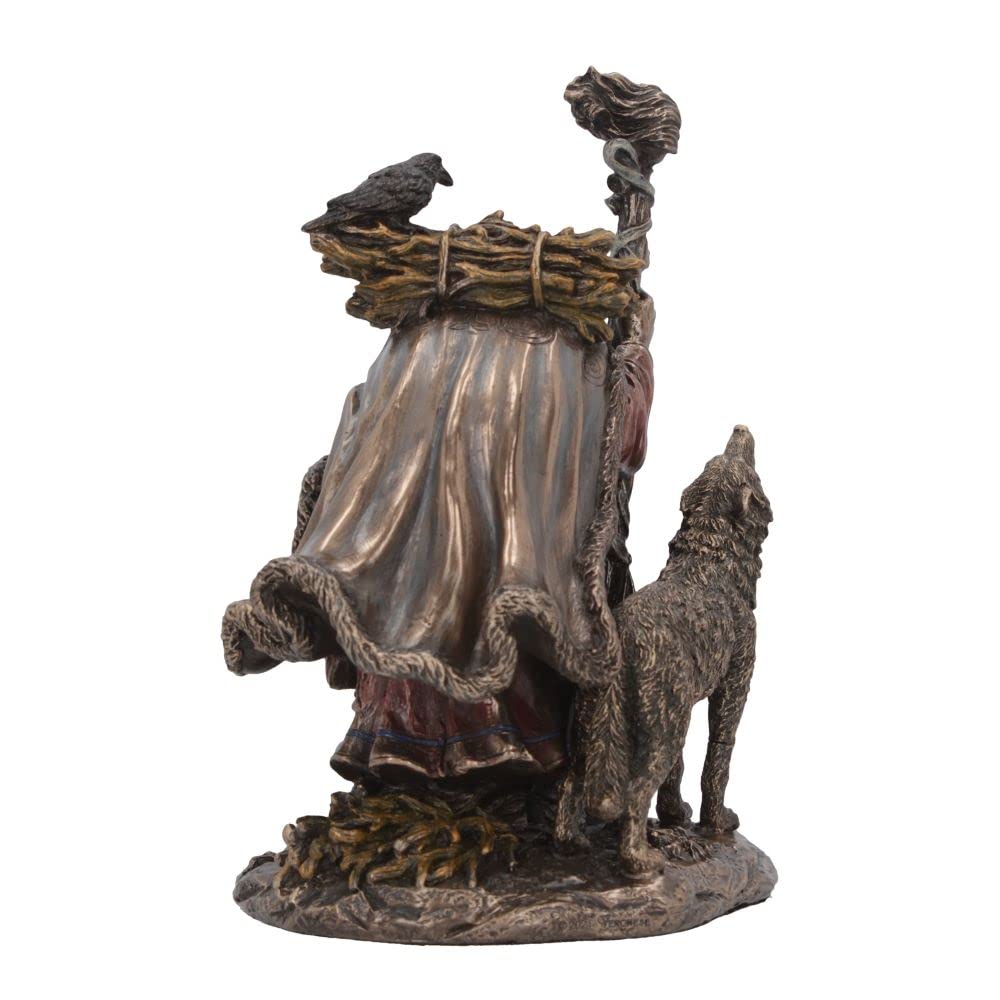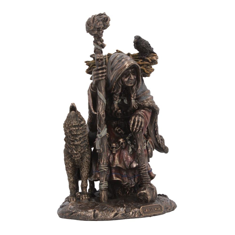 The Cailleach was a celtic goddess who ruled over the winds and winter. She appeared as an old, veiled woman, who was both creator and destroyer and served as a patron of wolves. This bronze figurine shows her crouched down, rough pigtails appearing from her veil, she holds a large wooden stick in one hand and a wooden mallet in the other. She is joined by a howling wolf who stands by her side. Cast in the finest resin before being expertly finished in bronze, this Cailleach figurine will make the perfect addition to any historic or mythology collection.