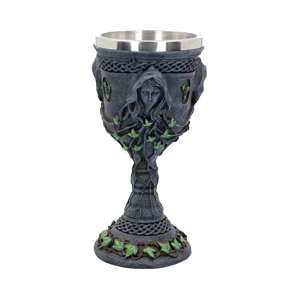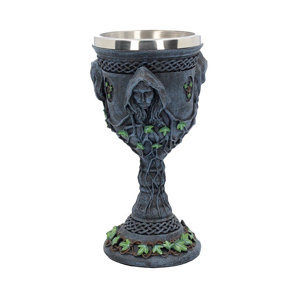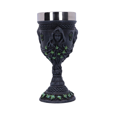Drink to the Triple Moon Goddess with this Mother, Maiden and Crone chalice from Nemesis Now's Gothic wholesale giftware collection. The faces of the Maiden, Mother and Crone sit on an alternative sides of the goblet, connected by intricate root networks covered in Ivy. This foliage is carried through to the stem and even the base which also has a Celtic pattern bordering it. Cast in the highest quality resin before being hand-painted, this goblet also features a removable stainless steel insert which aids cleaning.