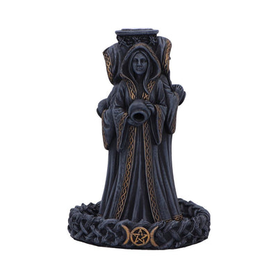 Embrace the sacred cycles of life with our Triple Moon Goddess Backflow Incense Burner from Nemesis Now's premium collection. Crafted from high-quality resin and painted in elegant black with intricate gold detailing, this burner depicts the symbols of maiden, mother, and crone encircling a central pillar. Atop the pillar, an incense cone delicately releases fragrant smoke, descending from pots held by each of the symbolic women. The smoke gracefully pools in a wreath of Celtic knots beneath them, creating a mesmerizing visual display. This backflow incense burner is a tribute to the ancient wisdom of the triple goddess and the interconnectedness of life's phases. As part of our extensive collection, it's perfect for those who seek to infuse their space with the magic and symbolism of the mother, maiden, crone. Explore our wide range of mother, maiden, crone, Wiccan, and witchcraft-themed giftware, each piece crafted to enhance your spiritual journey and connection to the divine feminine.