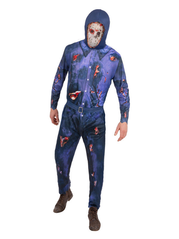 Step into the chilling world of Friday the 13th with the Jason Voorhees Boiler Suit Costume for adults. This all-in-one blue boilersuit features realistic gory effects that bring the infamous slasher to life, complete with an attached masked hood for an authentic look.