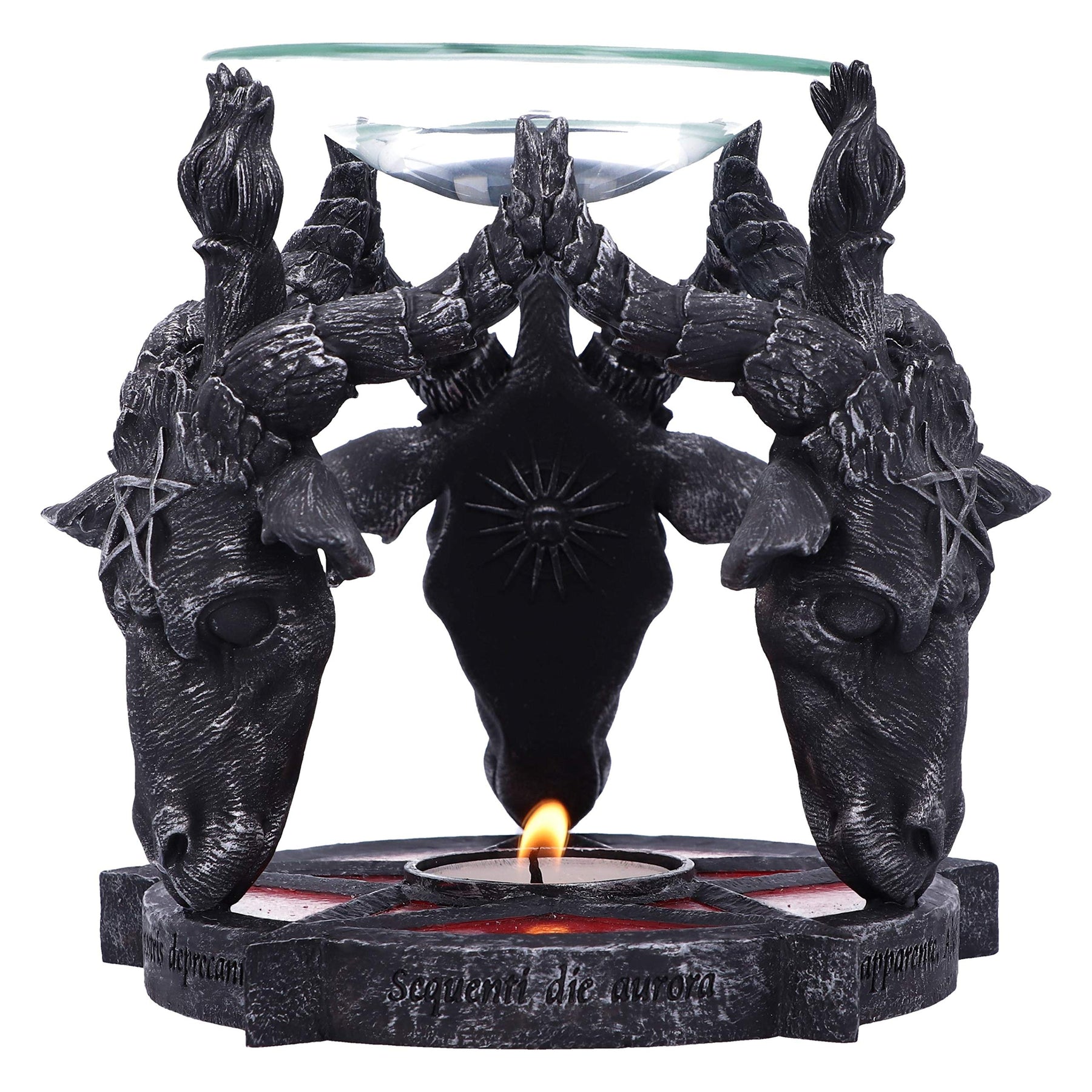 From the twisted minds of alternative brand Nemesis Now's in-house design team, this occult Oil Burner is a beautiful piece. Above a patent red base sits a pentagram, forming a plinth in which three Baphomet heads are standing to attention. Pentagrams protrude from their heads while their horns for the perfect base for a small glass oil-burning dish. Cast in the finest resin before being painstakingly hand-painted, this piece would make the perfect addition to any Gothic home.
