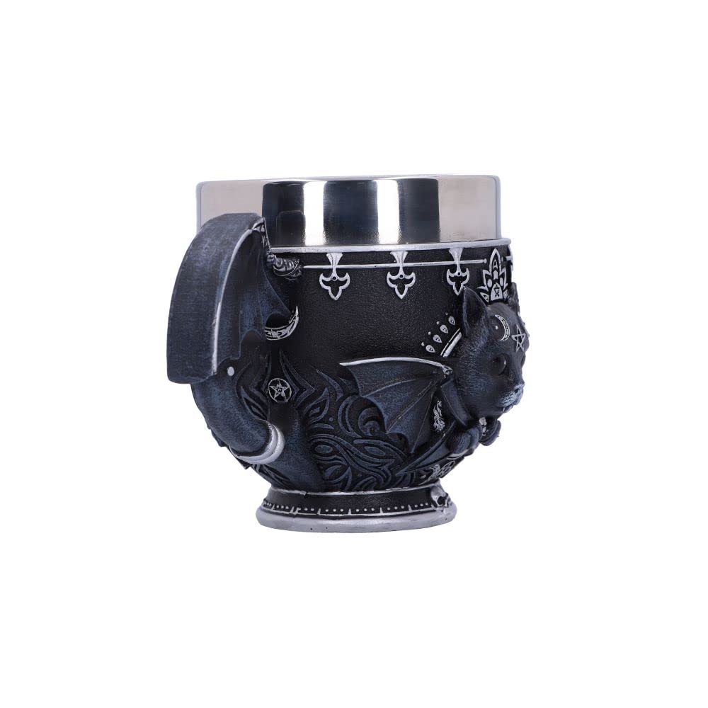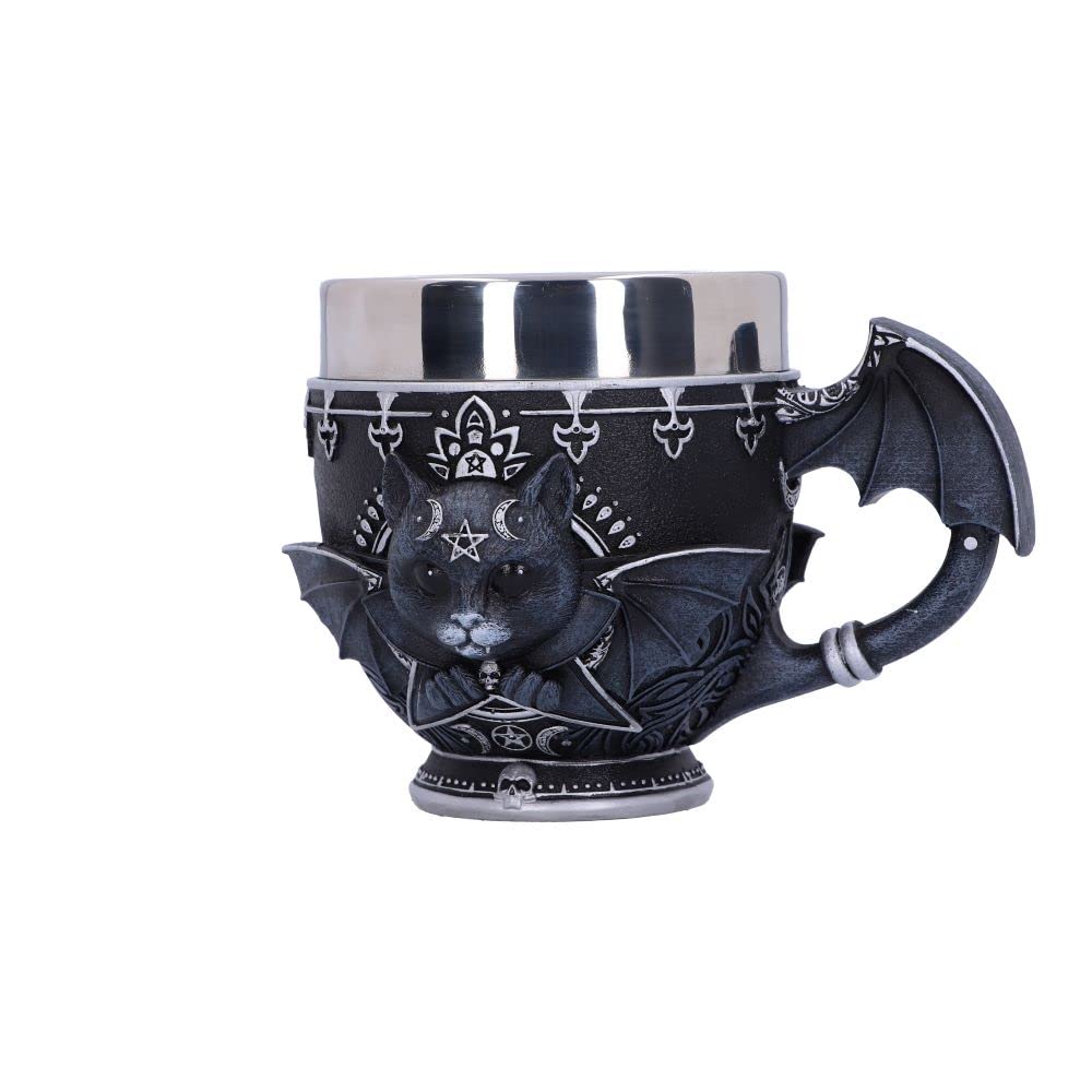 Sip on your favourite beverage and raise your pinky with this Pinkys Up Malpuss cup. Malpuss the union of good and evil stares at you adoringly, as you look into their black eyes you notice the darkness that resides within. Decorated in ornate silver detailing, the handle of the cup is shaped like Malpuss's bat wings. Cast in the finest resin before being expertly hand-painted, this Pinkys Up Malpuss cup is perfect for any gothic lover or collector of Nemesis Now's Cult Cuties range.