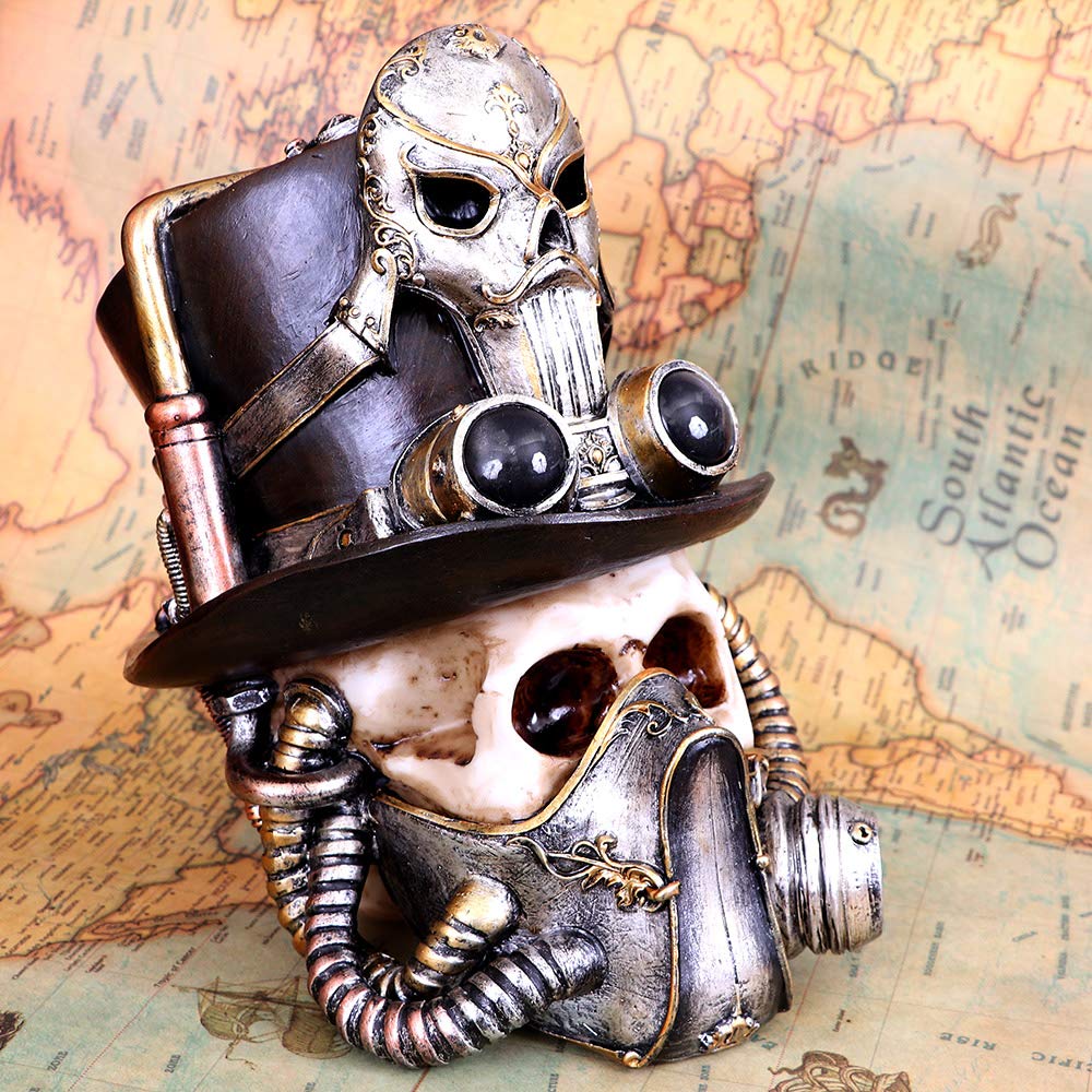 Over the jaw and nose of the skull is a silver air purification mask with gold trim. Protruding out of the side of the mask are copper pipes connecting it to the mechanical apparatus which appears to be stored inside the top hat. Resting on the rim of the hat are a pair of silver steampunk goggles, behind them is masked figure made from the same material. Cast in high-quality resin before being carefully hand-painted, this statuette is a great reminder to budding engineers to wear breathing apparatus when working with dangerous phlogiston.