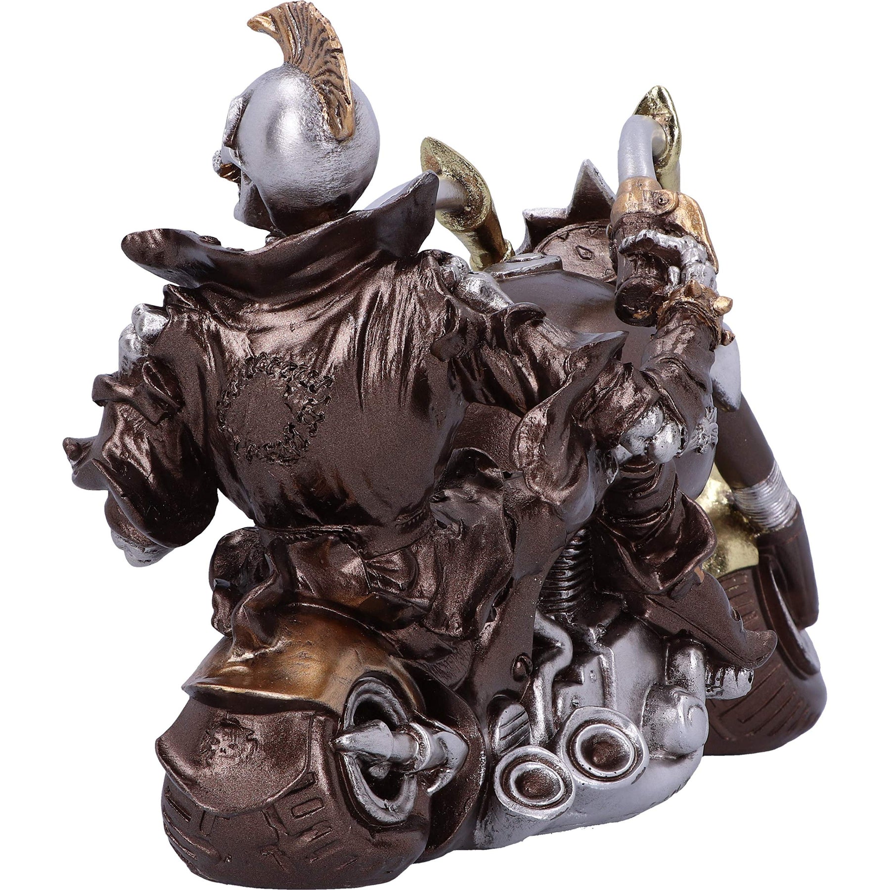 From steampunk masters Nemesis Now, this biker is ready to ride hell for leather! Built from steel and terror, this large cruising bike is fronted by a menacing fanged skull. A bulbous chassis with winged skull decoration for the base for the long curved handles. Straddling the bike, arms folded, a skeleton with a coppered mohawk wears a black leather biker jacket and torn jeans in true rebel fashion, complete with a cigar hanging from his jaw. Cast in high-quality resin before being painstakingly hand-painted, this is a perfect gift for any rebel reaper whos ready to ride.