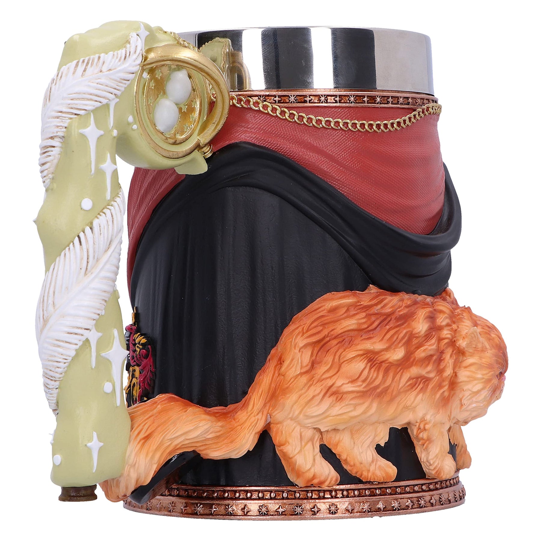 Discover the Wizarding World with our Officially Licensed Harry Potter Hermione Tankard. Dressed in the Gryffindor work robe, shirt and striped tie, this highly detailed Tankard features Hermiones wand quill and time turner on the handle as well as her pet Crookshanks on the back. Cast in the finest resin before being expertly hand painted, this Hermione Tankard is perfect for any witches, wizards and muggles alike!