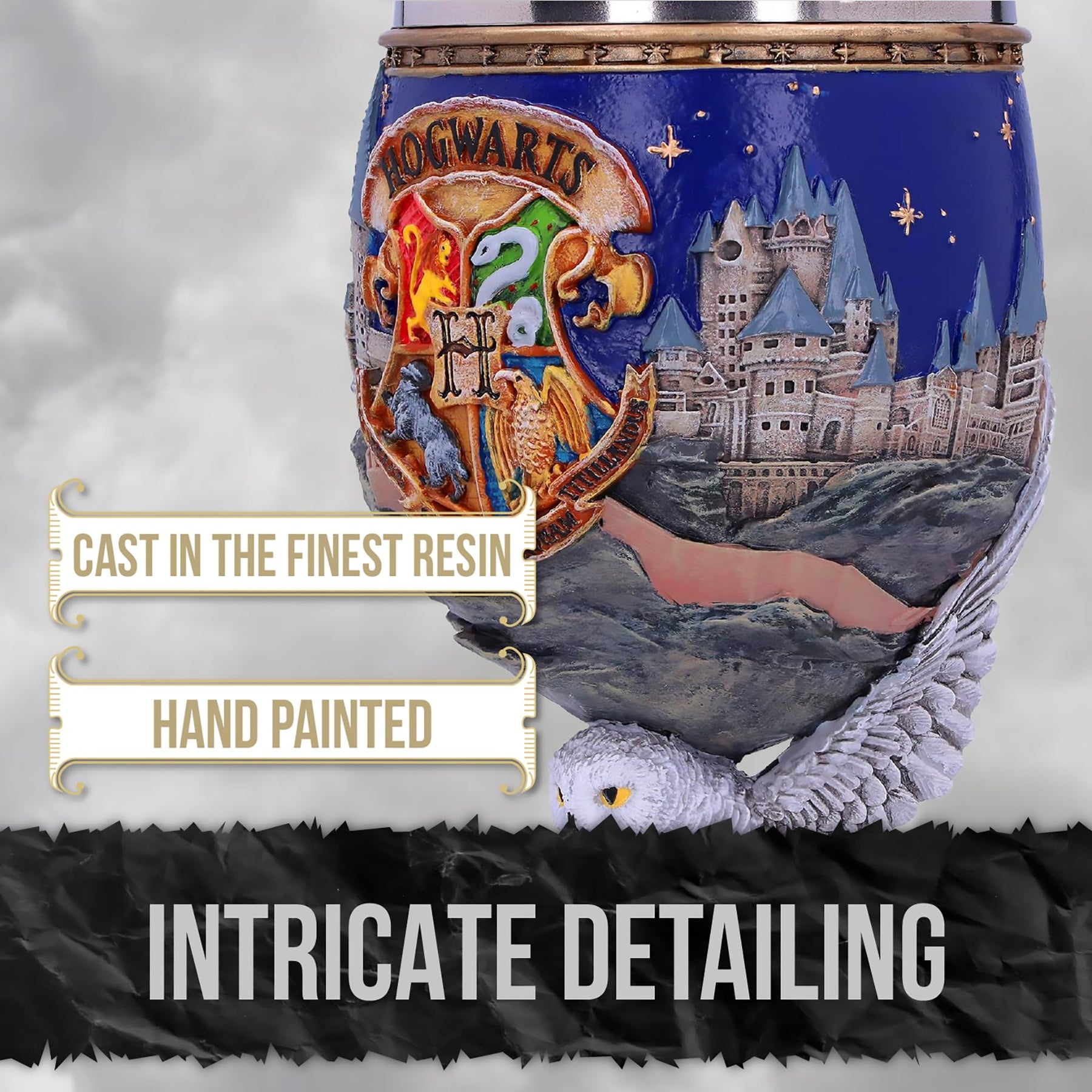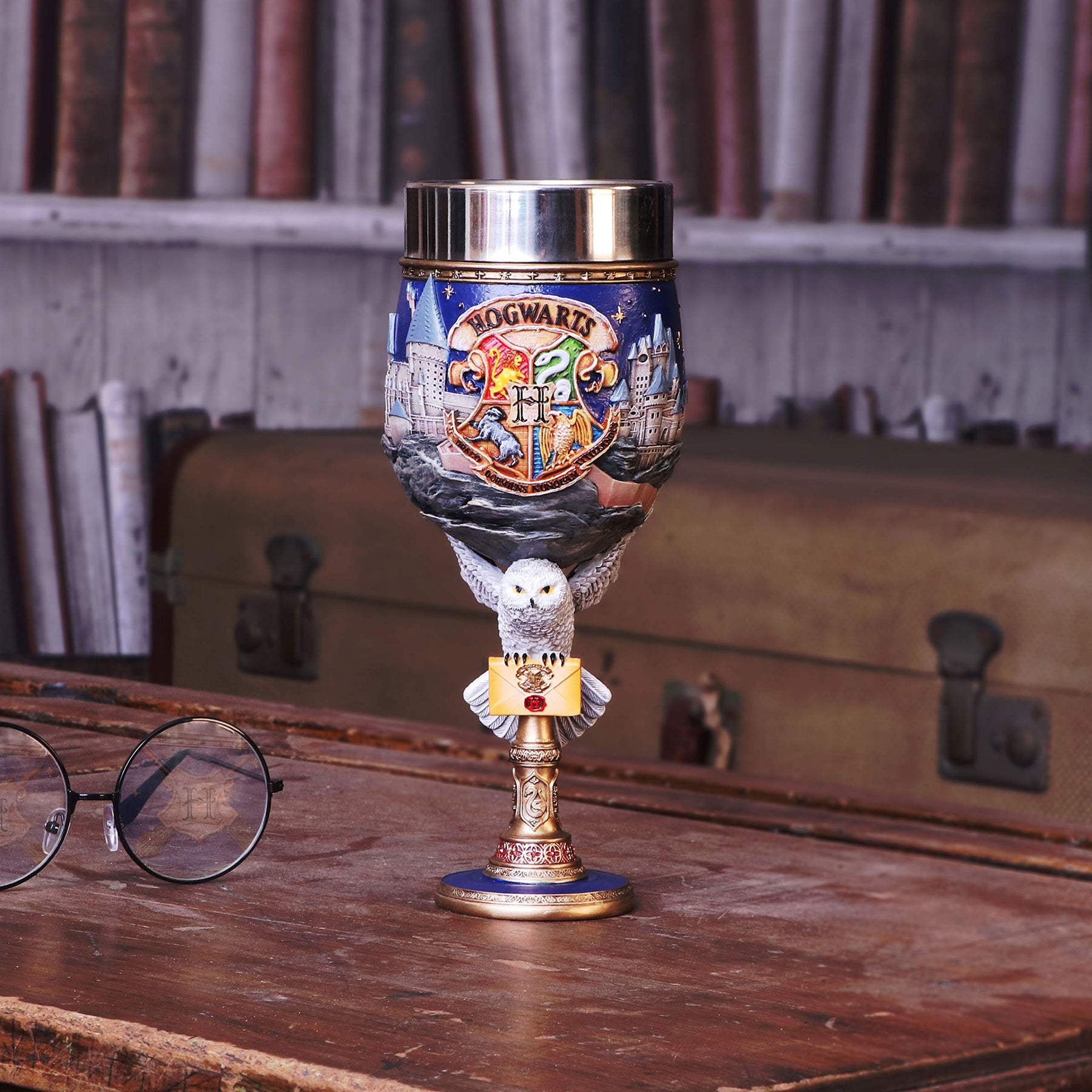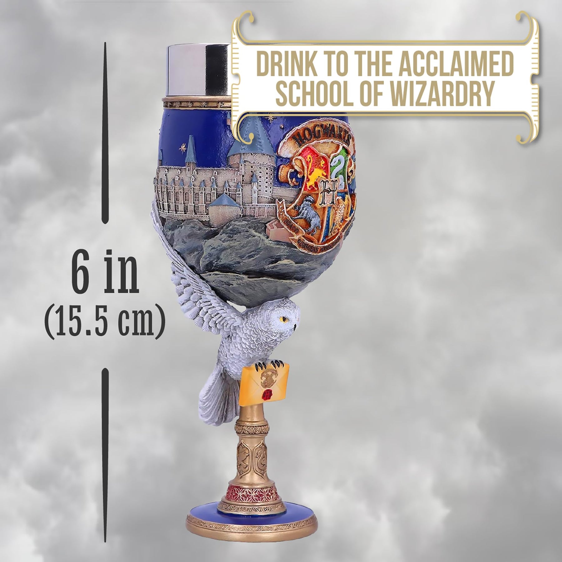 Show your passion for the finest School of Witchcraft and Wizardry in the world with this officially licensed Hogwarts collectable Goblet. The focal point of the Goblets cup is the Hogwarts Crest, featuring the four houses of Gryffindor, Slytherin, Hufflepuff and Ravenclaw, which is flanked by a 3D landscape of Hogwarts school itself. Below the castle, Hedwig, the white owl, forms the top of the stem, carrying a Hogwarts Acceptance Letter. Beautifully crafted in the finest resin before being expertly hand-painted, this piece will bring a little Hogwarts magic into any home and can be enjoyed by witches, wizards and Muggles alike.