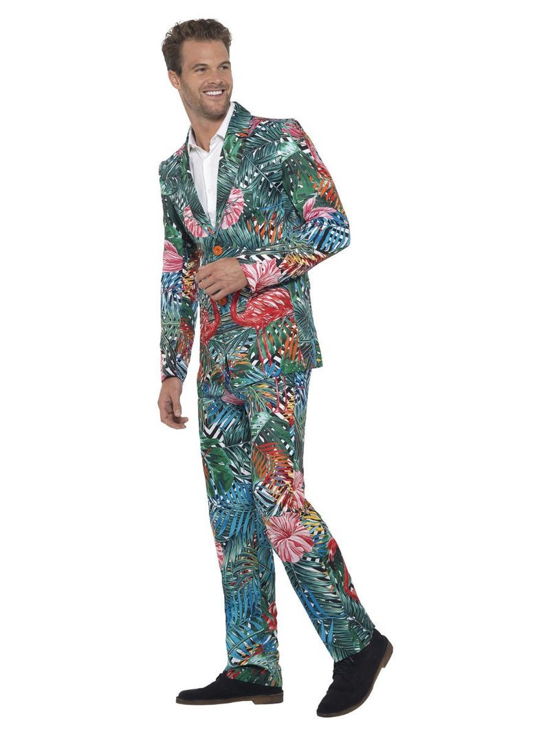 Make your next event unforgettable with this Hawaiian Tropical Flamingo Suit. Get ready to turn heads and add a splash of tropical fun to your look!