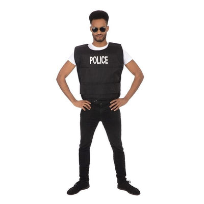 The design mirrors the practical and recognizable aspects of a police vest, featuring pockets and holders for various tools and equipment, such as radios, handcuffs, and notepads, to enhance the realism of the imitation. The vest might include adjustable straps to ensure a secure fit for a wide range of body sizes, making it versatile for different wearers.