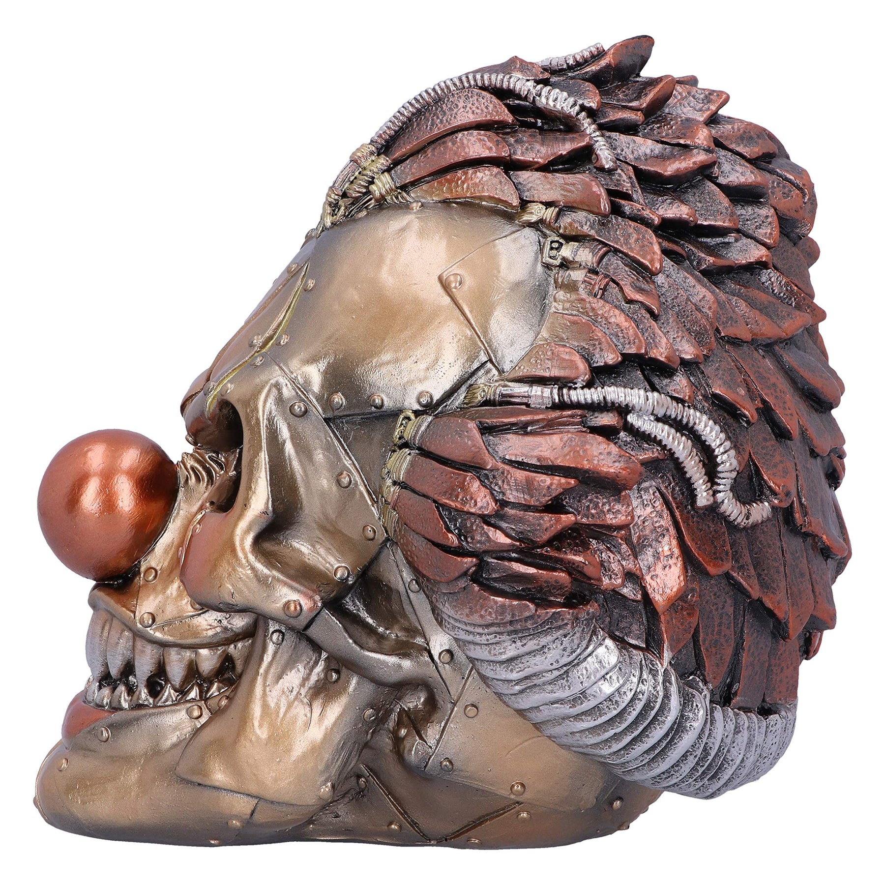 This menacing steampunk skull comes from alternative masters Nemesis Now. This unnerving being has large empty eye sockets and a bright metallic nose in a deadly shade of red. The carved outline of the stage make up makes it look as though there are large scars from its forehead to cheekbones and beneath a wide pair of ruby red lips, a set of sharpened teeth protrudes, which only adds to the terror. Cast in the finest resin before being expertly hand-painted, this piece would be perfect for any classic horror steampunk fan. Just make sure you sleep with one eye open.