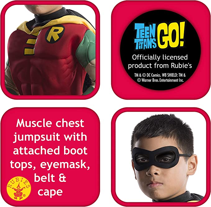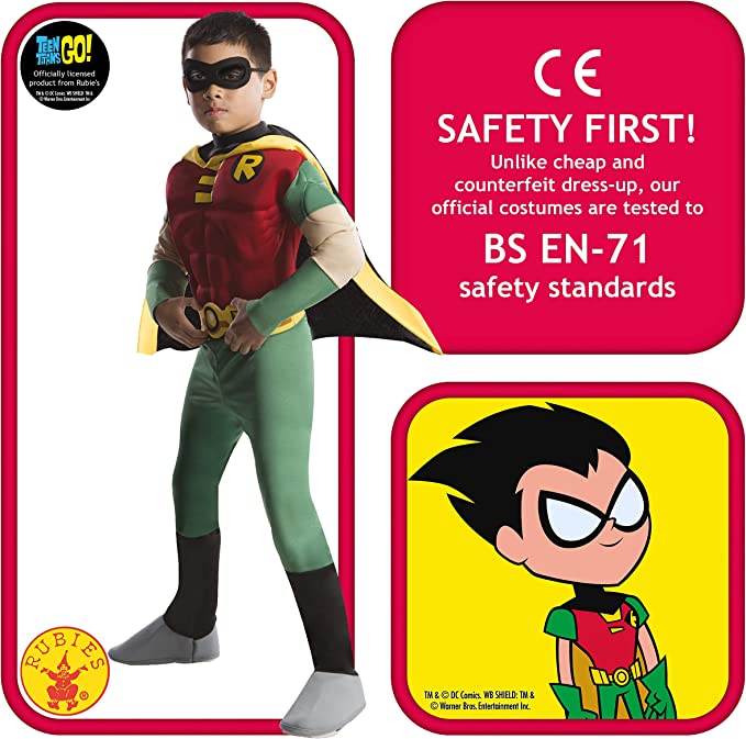 It features Robin's classic red and green jumpsuit with a padded muscle chest and yellow R emblem on the chest. It also includes Robin's yellow cape and belt as well as a black face mask to make sure no villains can identify your child on Halloween. Check our accessories section for matching gloves, and get one of your child's friends to dress up as Batman for even more fun!