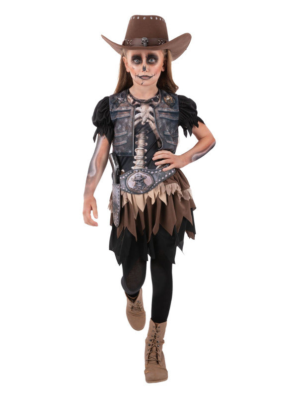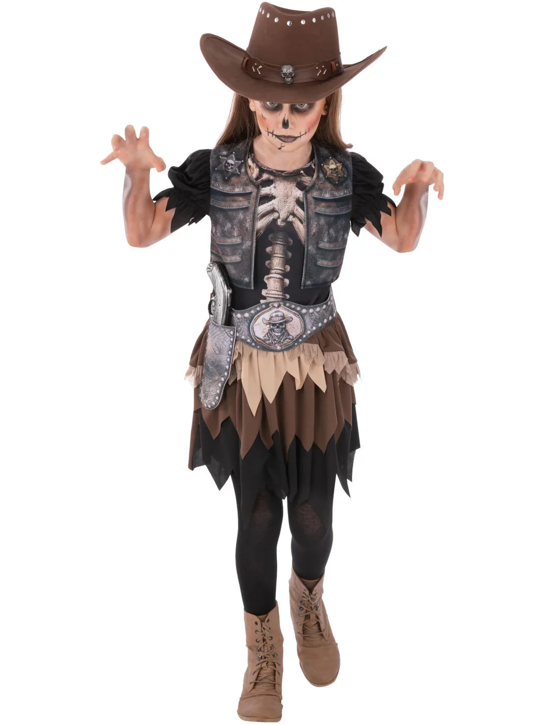 Yee-haw, little cowgirls! Get ready to ride into Halloween with our Kids Skeleton Cowgirl Costume. This spooky yet stylish Skeleton Cowgirl outfit for girls is perfect for any Wild West adventure or trick or treating escapade.