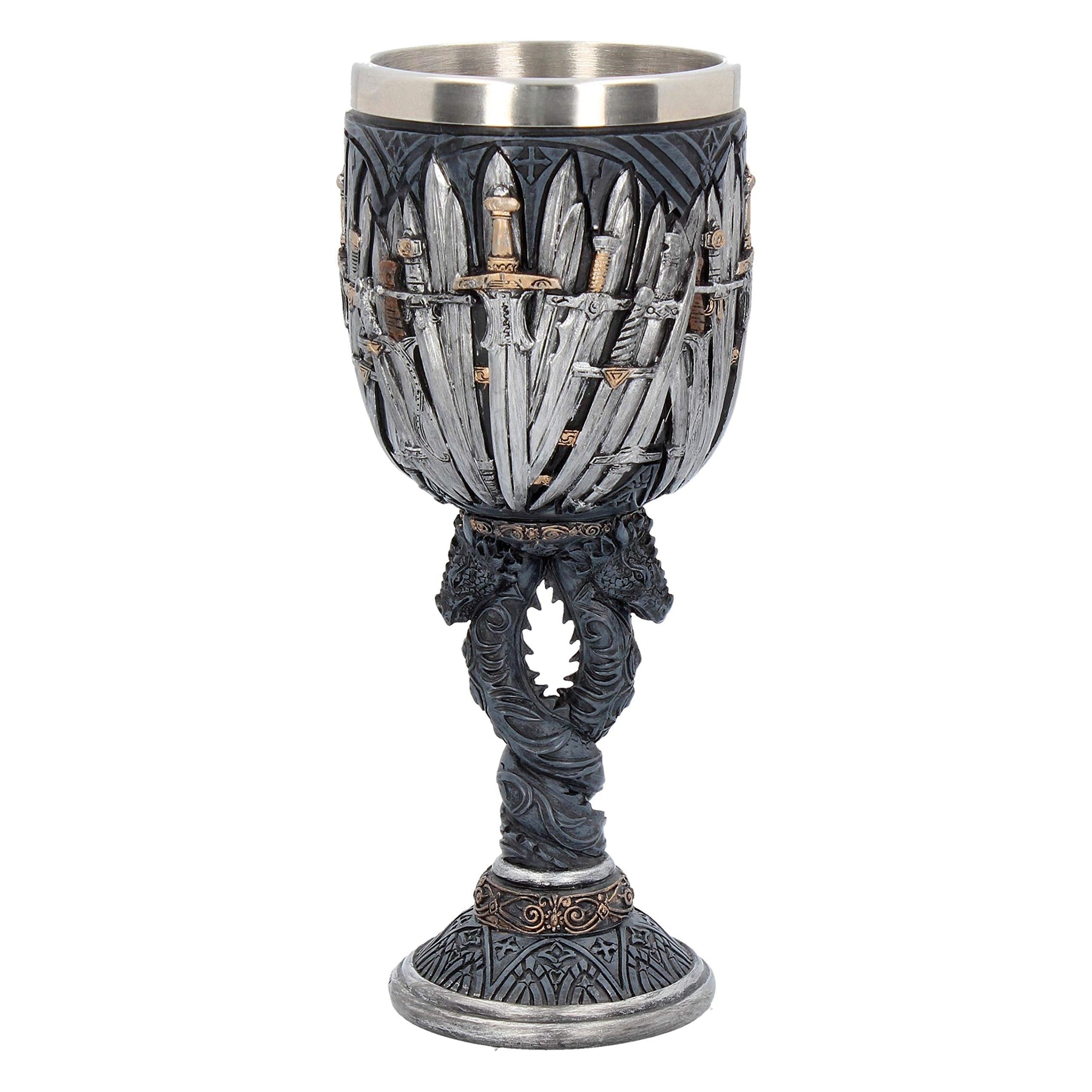 This goblet was created by alternative brand Nemesis Now's highly talented in-house designers. This goblet's stem is the heads of two black Dragons, their necks entwined, their heads facing outwards. Resting on them, the body of the goblet is emblazoned with a multitude of swords on a black background. Cast in the finest resin before being painstakingly hand-painted, this goblet comes with a removable stainless steel insert for ease of cleaning.