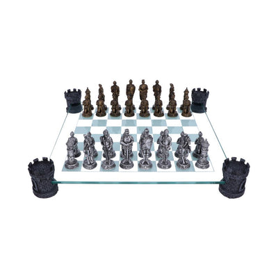 Flex your brain and challenge your friends with this medieval chess set rom historical masters Nemesis Now. Held above the table by 4 black towers, this glass chessboard has Viking-style geometric knots and interlinking loops around the edges. On it, two fearsome armies face each other - one a silvery legion of Knights, the other a golden congregation of opposing soldiers. With each piece cast in the finest resin before being carefully hand-painted, this chess set is the perfect way to recreate a historical battle and challenge your friends to a contest of strategy.