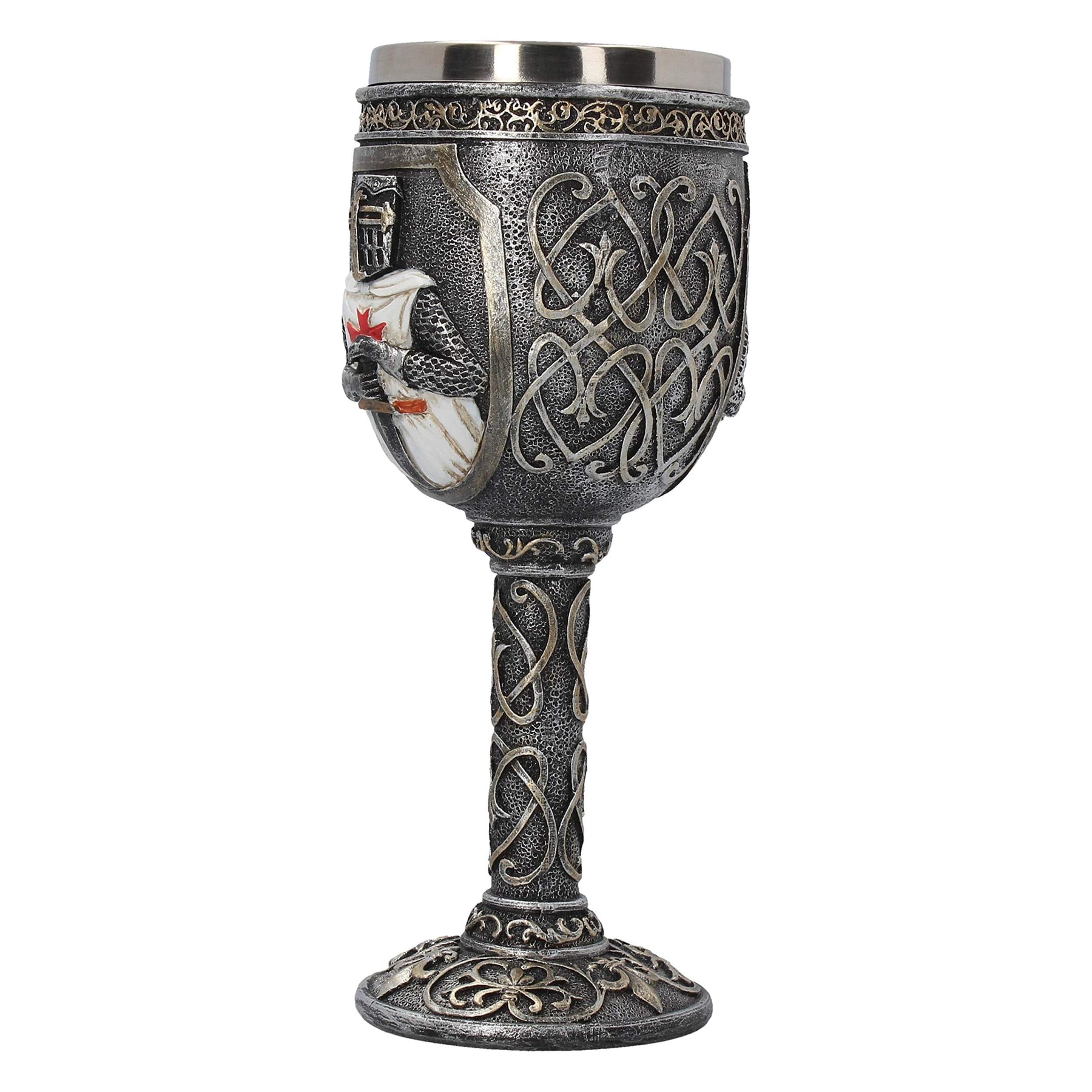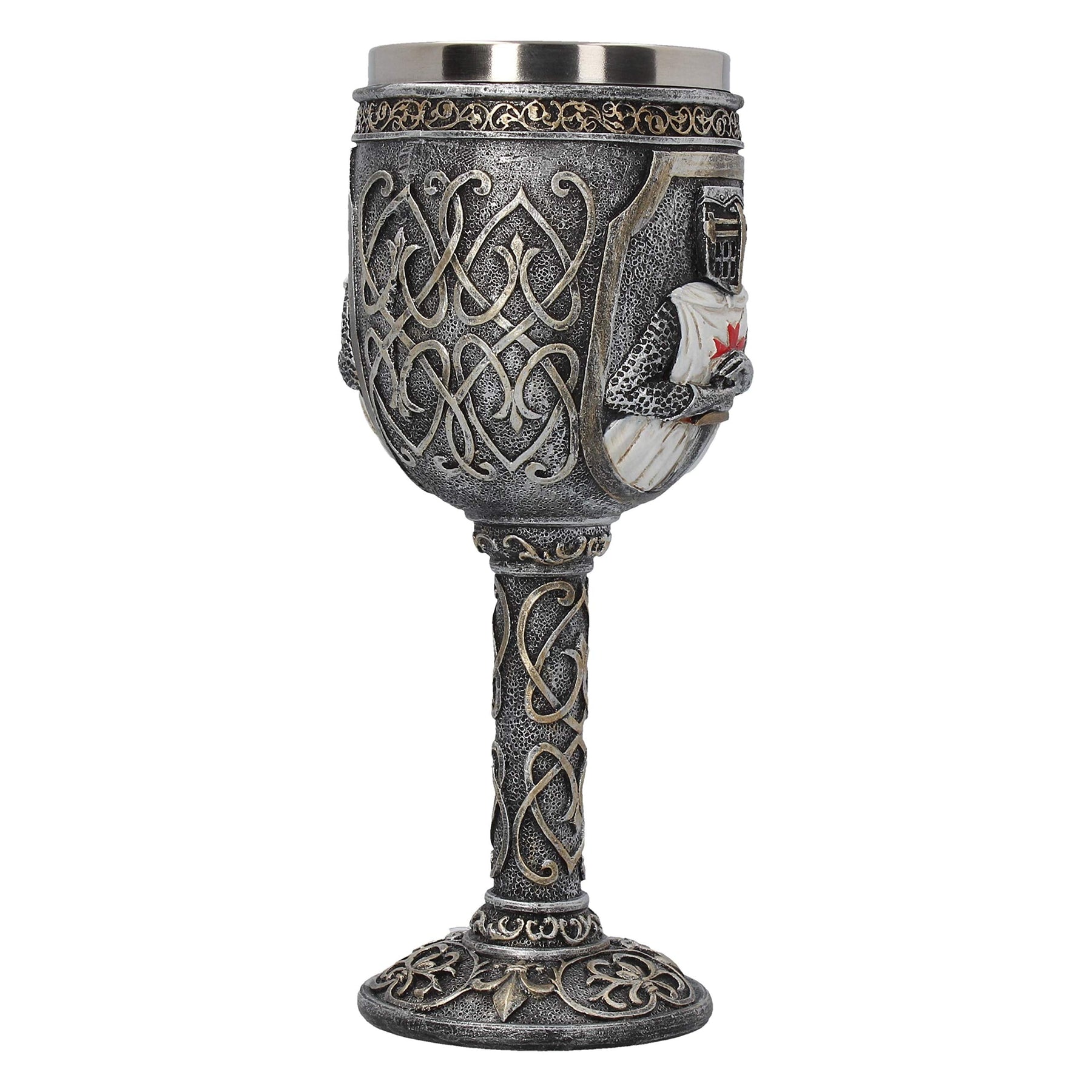 Wearing chainmail this medieval knight holds a sword to it's chest, beautifully sculpted on the main body of the goblet. Ornate detailing, highlighted in gold, covers the base and stem, continuing up and round the rim. Expertly hand-painted, this goblet looks like it is made from solid steel. A removable stainless-steel insert allows for easy cleaning. From alternative brand Nemesis Now's giftware collection, this goblet makes the ideal gift for any knight of the templar!