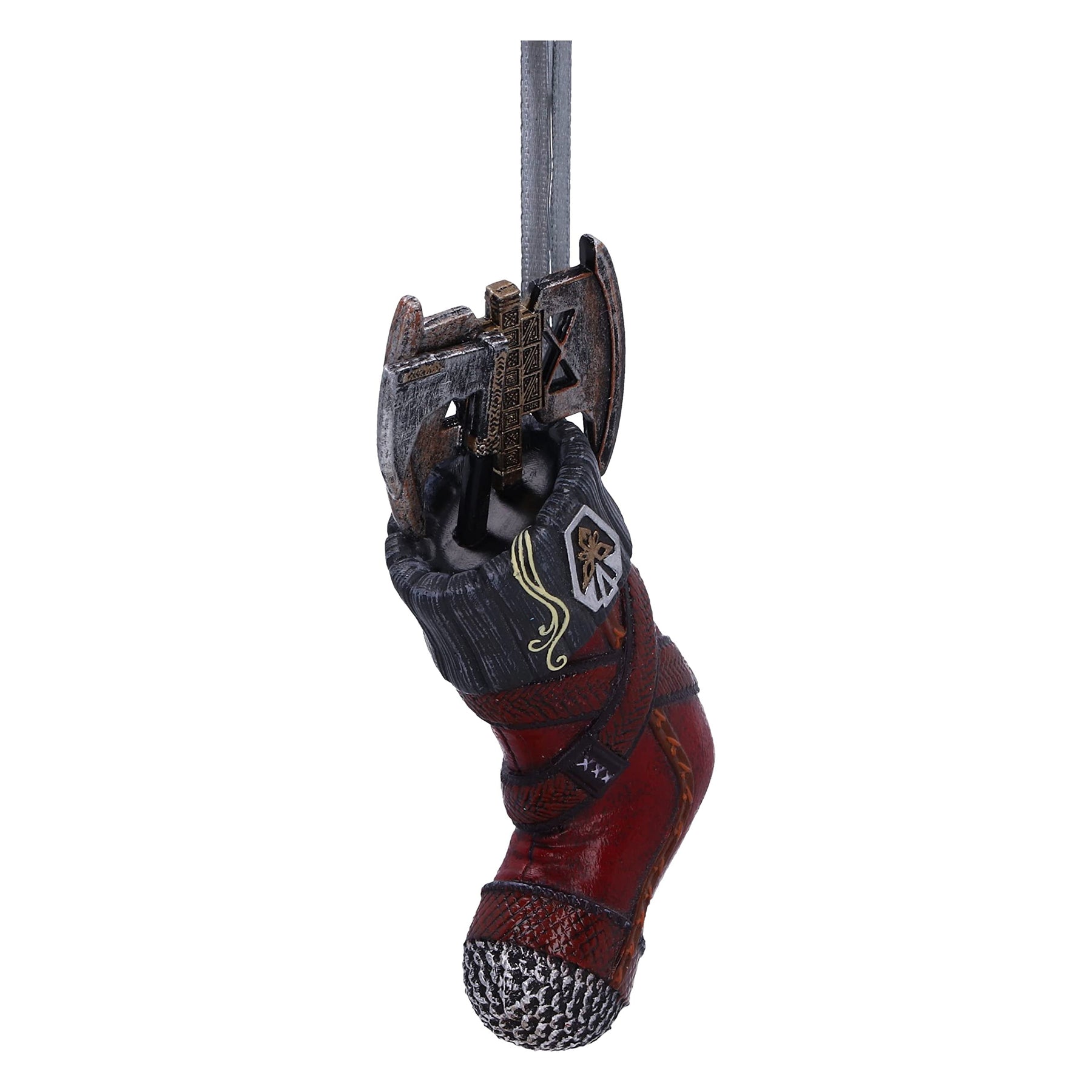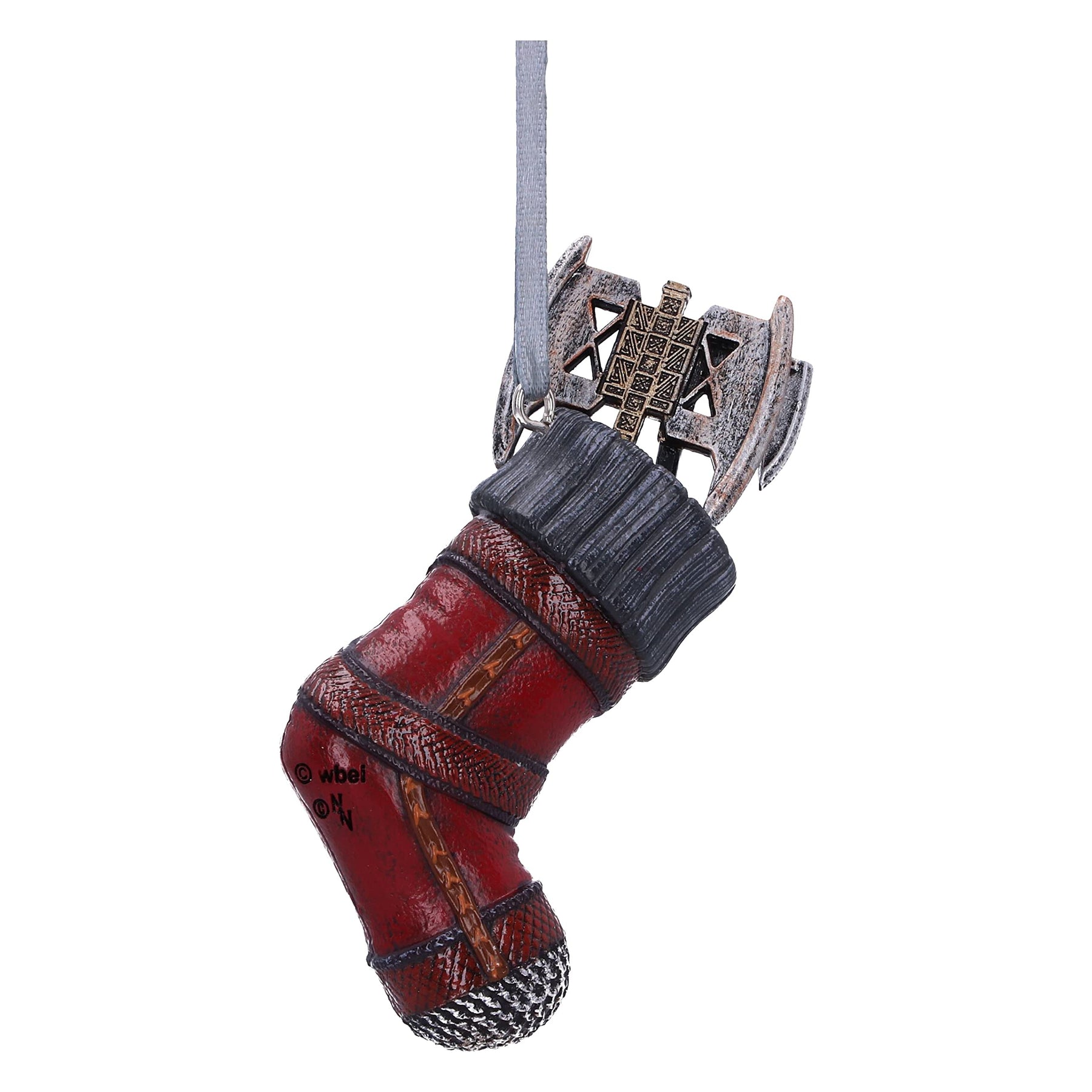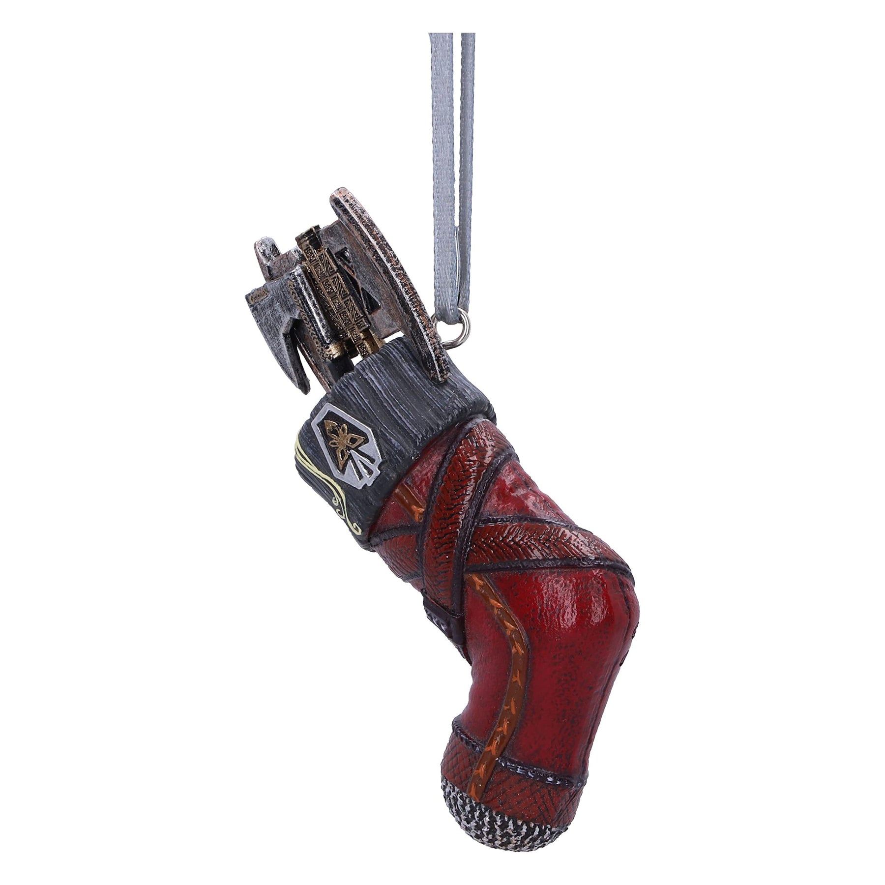 Travel the mystical worlds of Middle Earth with Nemesis Nows officially licensed Lord of the Rings Gimli™ Stocking Hanging Ornament. Inspired by Gimli's™ red leather armour, this hanging ornament features the instantly recognisible symbol which feautres on the front of Gimli's helmet, alongside his battle axes, which can be seen emerging from the stocking. Cast in the finest ‘Elvish resin before being expertly hand-painted, this exquisitely designed piece is the perfect addition to any Lord of the Rings collection.
