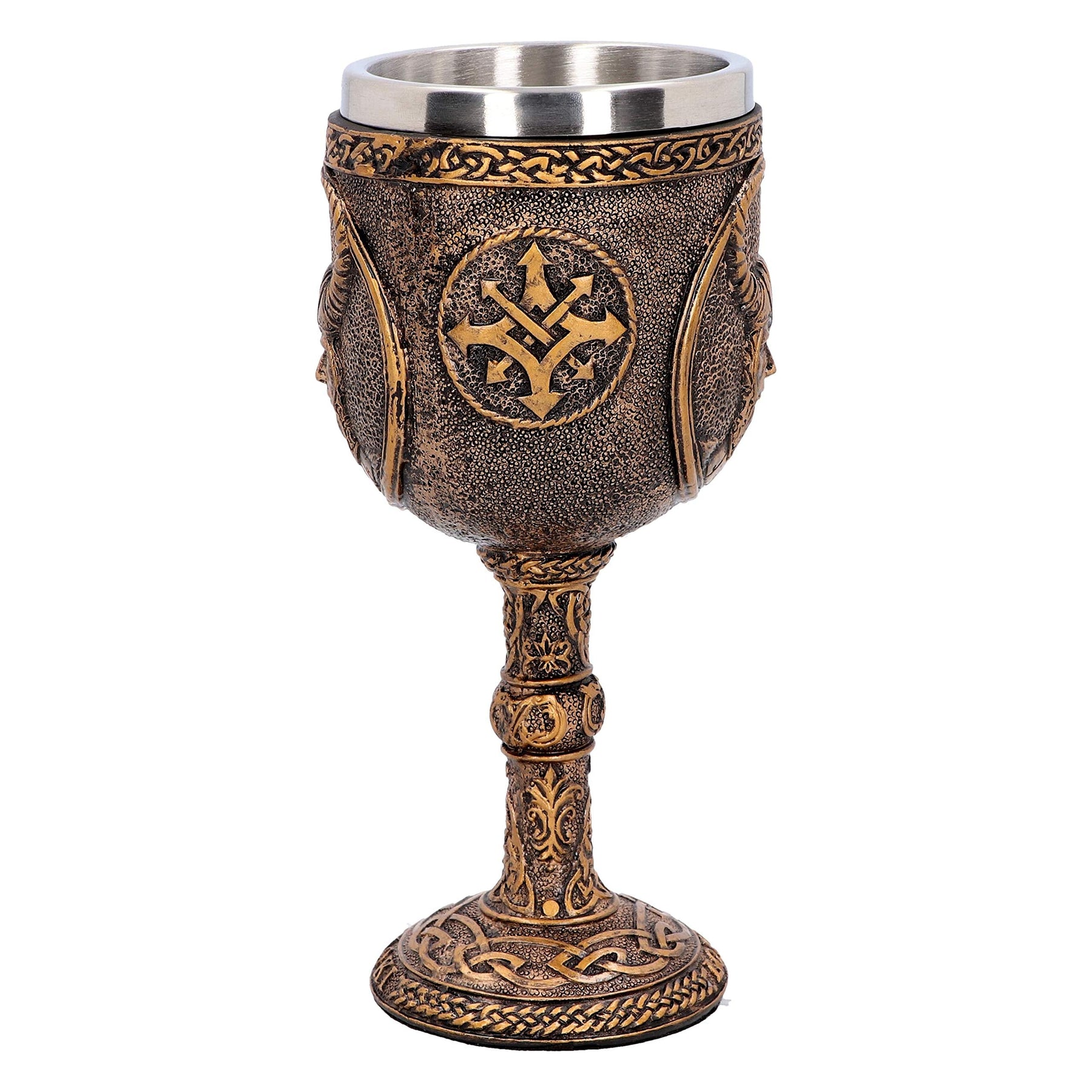Toast to Asgard with this fantastic Norse God goblet from alternative brand Nemesis Now's giftware collection. Rising from a base emblazoned with the name 'Loki' and encircled with Nordic runes and patterns, the stem of this goblet is bronzed, and covered in an elaborate runic pattern. The cup mirrors the runes of the base and features a raised portrait of Norse God Loki. Cast in the finest resin before being painstakingly hand-painted, and with a removable stainless steel insert for ease of cleaning, this goblet is perfect for drinking to the Norse Gods of Old.