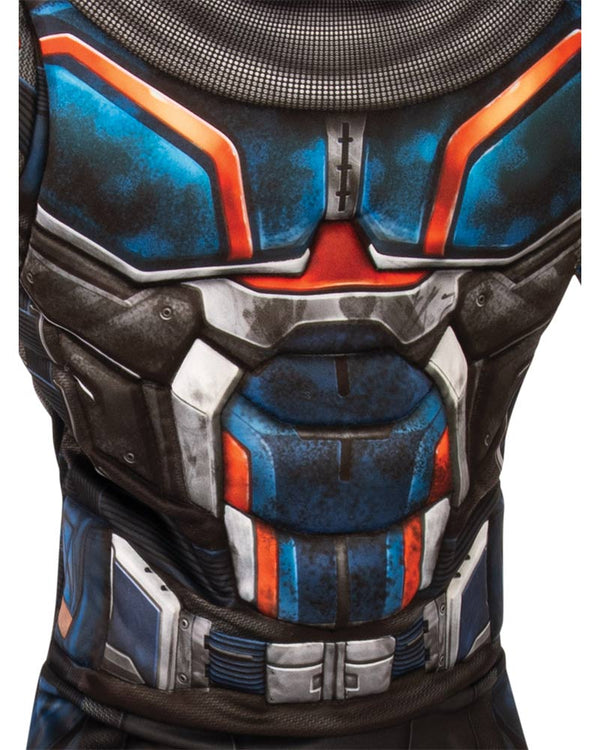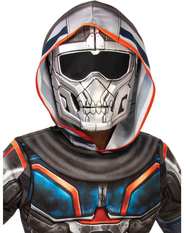 The kids Taskmaster costume features a black, blue, orange, and silver jumpsuit attached with a hood, gauntlets, and boot covers. In addition to a skull Taskmaster mask with mesh across the eyes to see through and elastic for easy fitting.