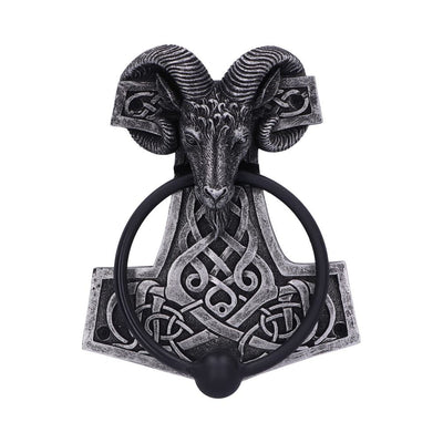 This Thors Hammer Door Knocker features the hammer of the thunder god, used as a deadly weapon and also as a way of providing blessings. The hammer was also worn as a pendant to those living in the Viking Age in the Scandinavian culture and in modern times to adherents of modern Heathenry. The head of a ram, horns curled around the top of the hammer holds the door knocker in its mouth. Cast in the finest resin before being expertly hand-painted, the knocker part is a solid metal ring, weighted to provide a loud knock. This Thors Hammer Door Knocker would make the perfect addition to any lover of the Viking Age.