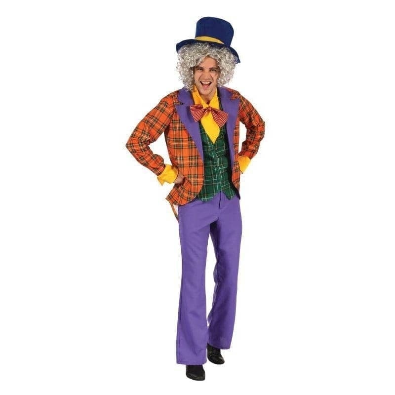 The mens Mad Hatter costume begins with a striking tartan print jacket, featuring a riot of colours that immediately draws the eye and sets the tone for the character's unconventional style. Beneath the Mad Hatter jacket, a vibrant green waistcoat takes center stage, its colour a perfect complement to the madness of Wonderland. Attached to the waistcoat is a yellow shirt front, adding a pop of brightness that enhances the overall whimsical appearance.