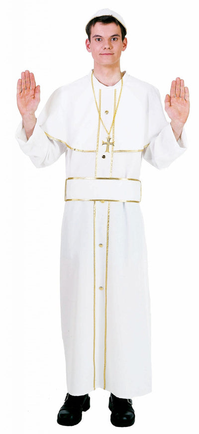 This Pope Costume Comprises Of One Long White Robe With Waist Sash and Headpeice. All Items Are White and Robe and Sach Are Decorated With Gold Trim. Suitable For Chest: 38 - 40; Waist: 32 - 34; Inside Leg: 32. 75.