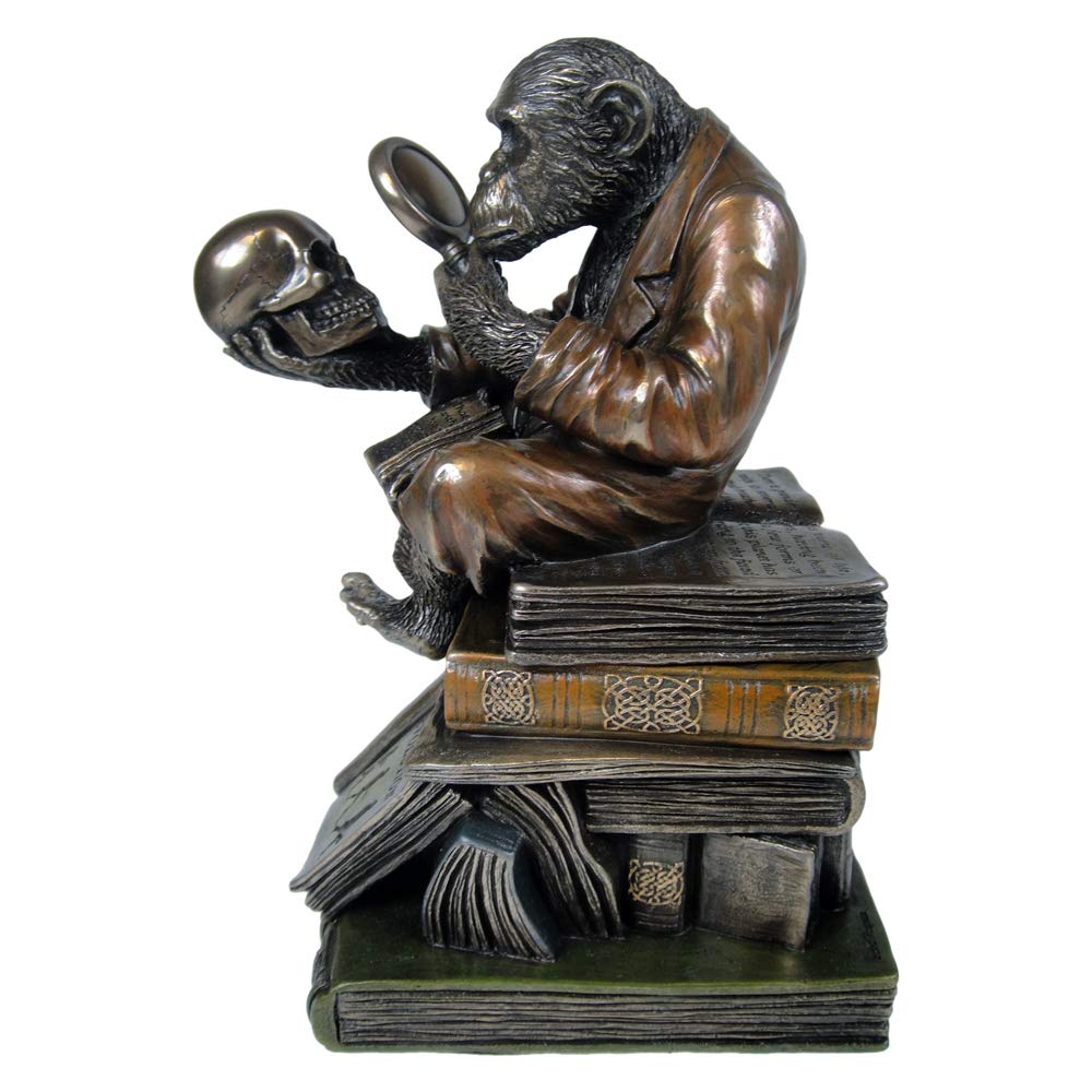 From alternative brand Nemesis Now, this thought provoking figure is cast in top quality resin before being lovingly finished in Bronze. Sitting on a pile of aged books, this personified chimpanzee studies a human skull. He wears a blazer jacket and uses a magnifying glass to clearly see his subject. Beneath his feet, Darwin's Theory of Evolution lays open showing a page outlining the evolution of man. Clearly the chimp sees that he's not so different from ourselves.