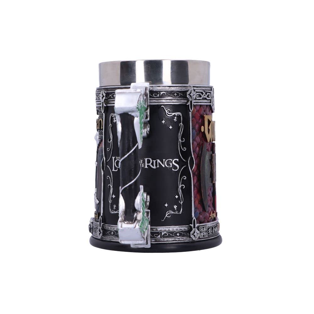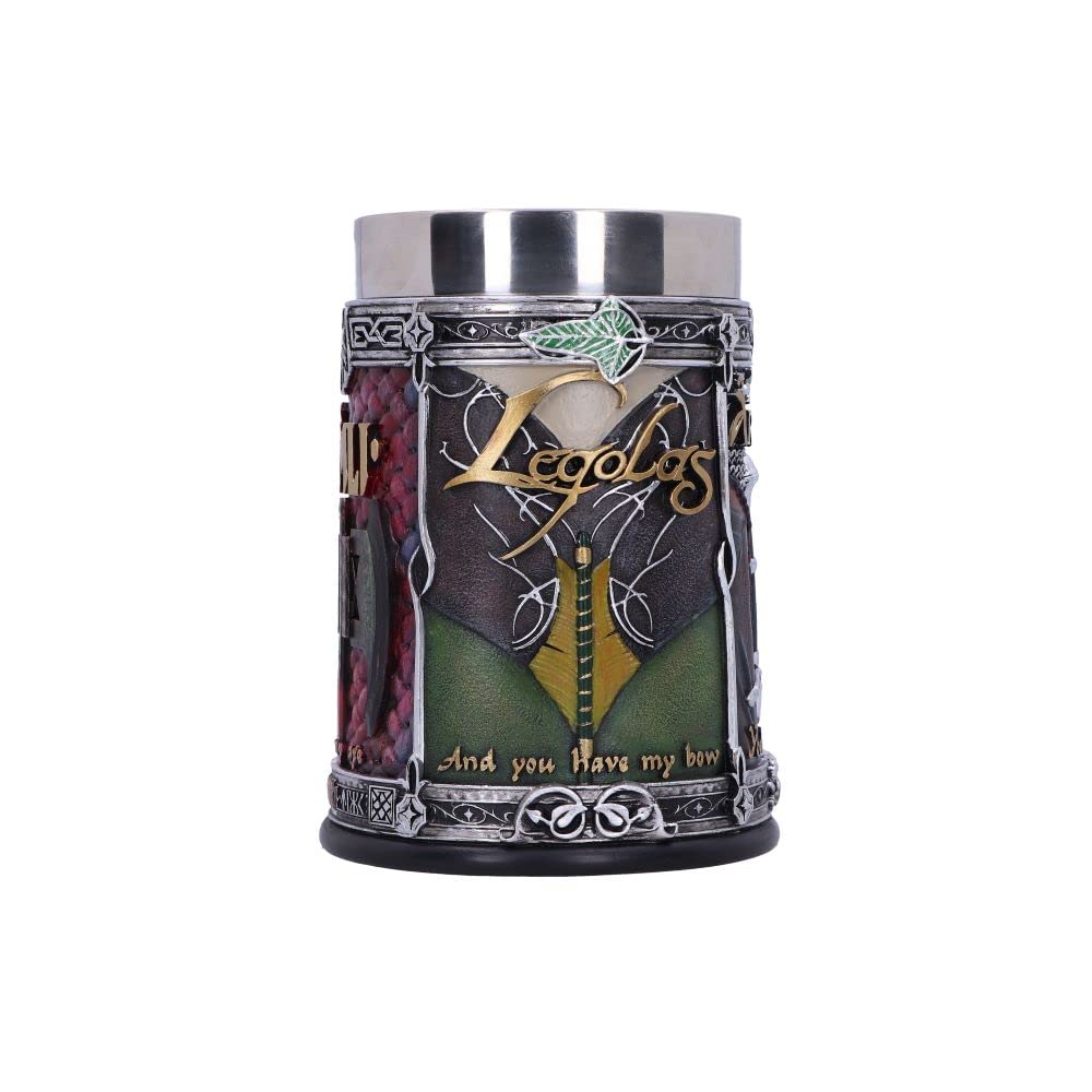 Featuring the iconic clothing and weapon of choice from Gimli, Legolas and Aragon. Each emblazoned with the corresponding name. This fellowship tankard is the perfect way to celebrate the Three Hunters while enjoying your favourite tipple. On the handle of this tankard the iconic Leaf of Lorien can be seen amongst the vines which wrap themselves around it. Alongside featuring the Lord of the Rings logo, this exquisitely designed piece is cast as well as the finest ‘Elvish resin before being expertly hand-painted