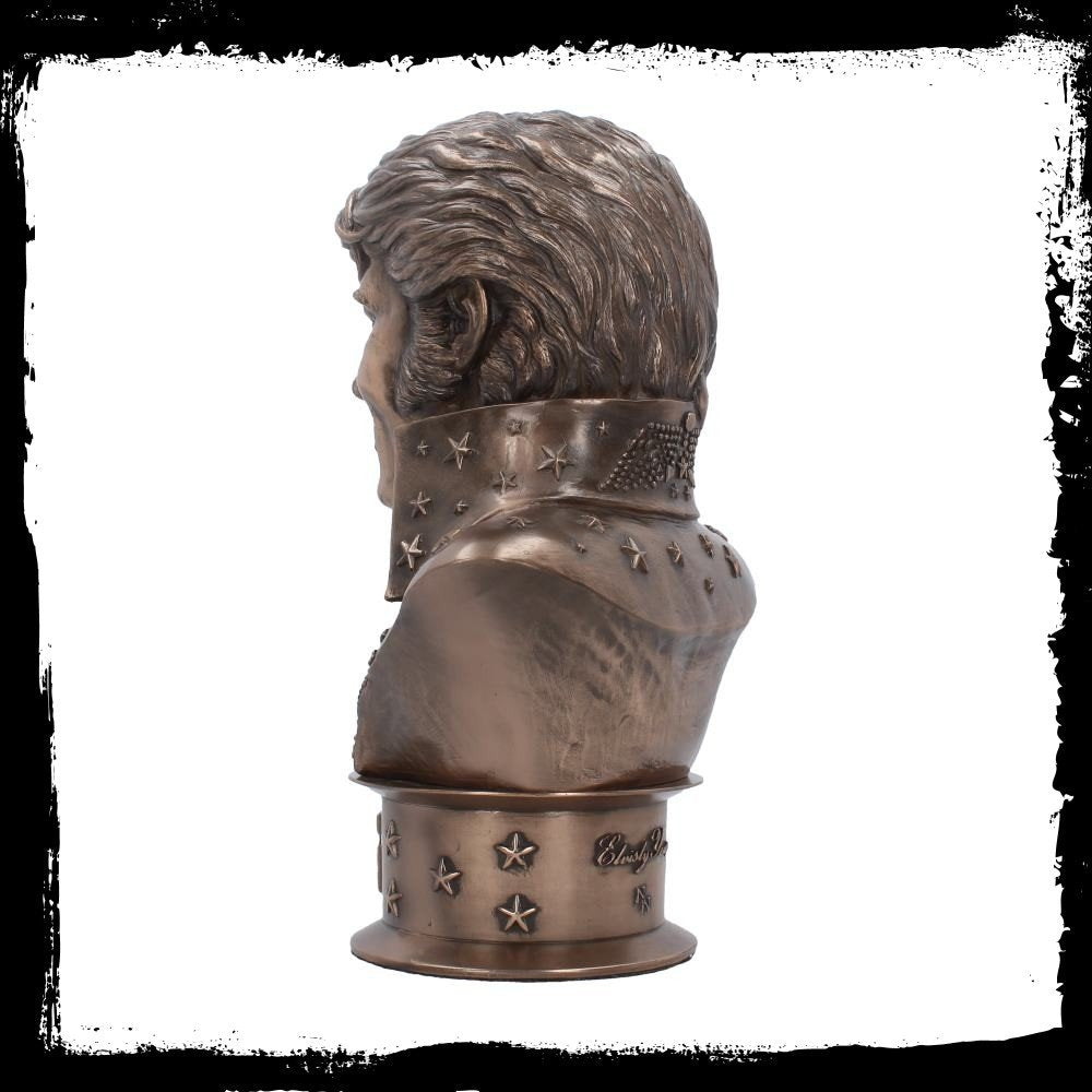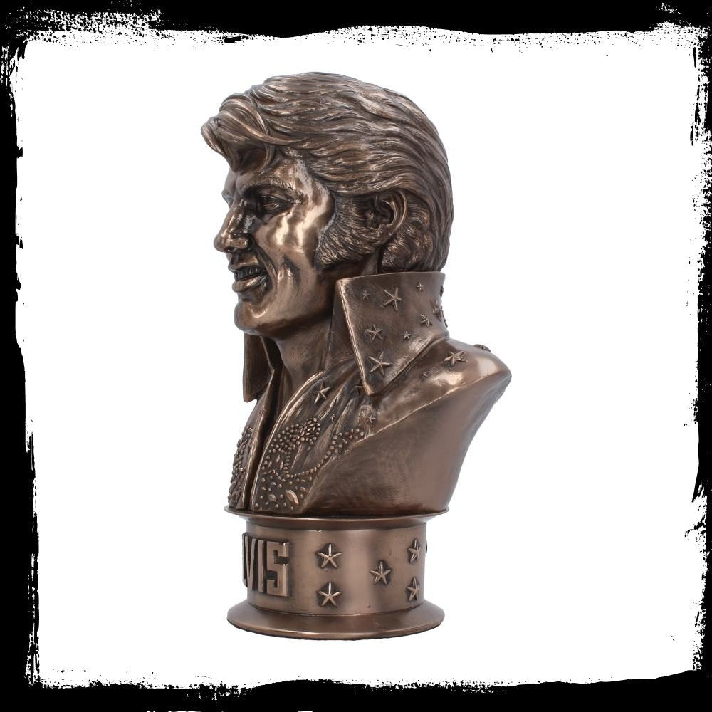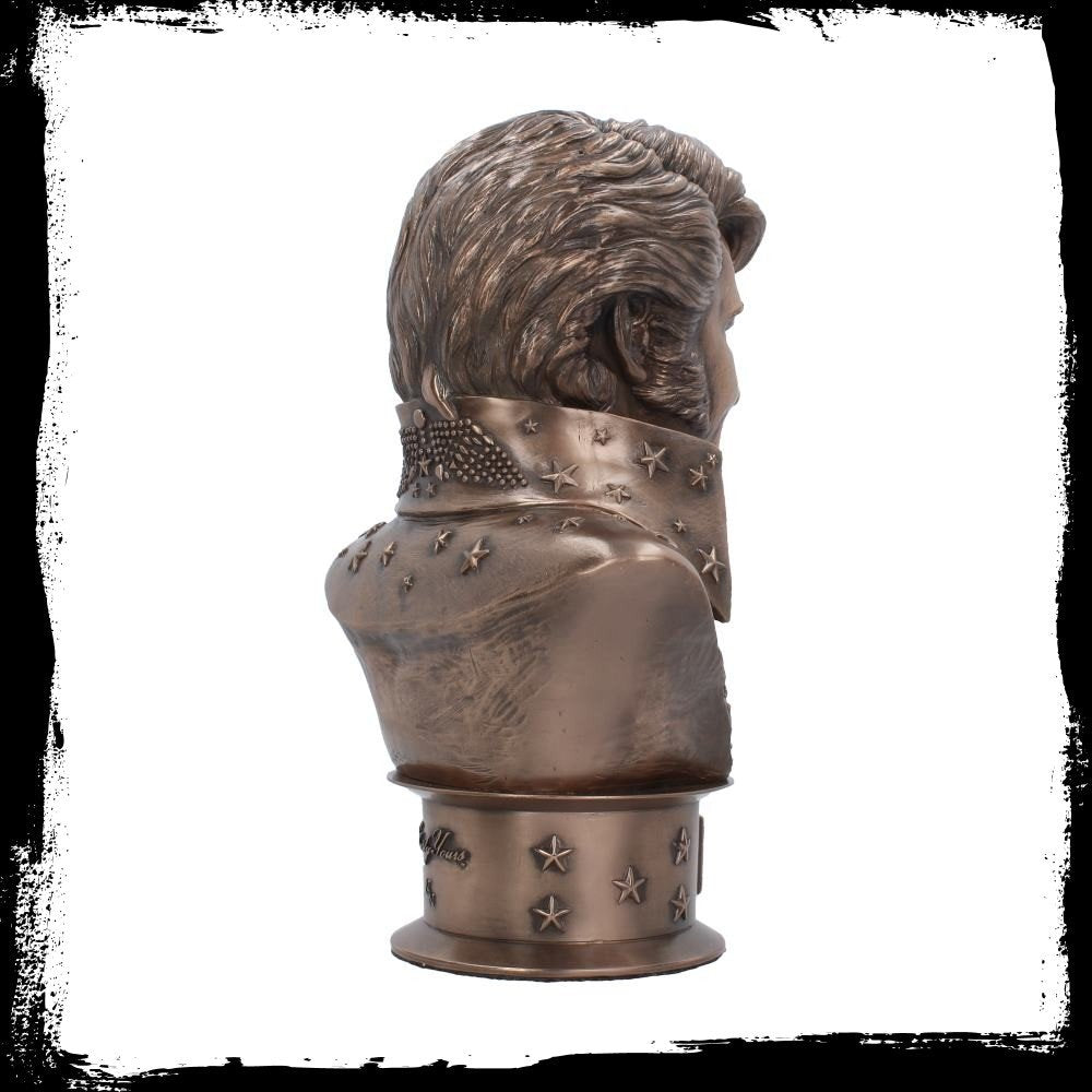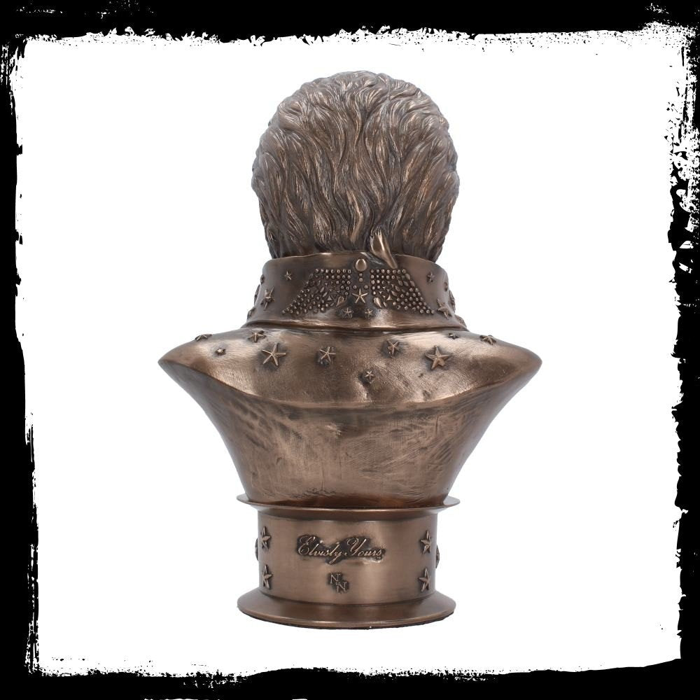 Have the King Himself in your home with this magnificent Elvisly Yours bust, created by alternative brand Nemesis Now. Appearing as he did at his world-famous Aloha From Hawaii By Satellite concert, Elvis looks straight ahead, the collar of his white jumpsuit rising up to cover his neck. His shoulders taper down to the bottom of the bust, where it's held up by a cylinder studded with stars, the name 'ELVIS' emblazoned at the front. Cast in the finest resin and given a bronze finish, this fantastic bust makes the perfect gift for any Elvis fan, young or old.
