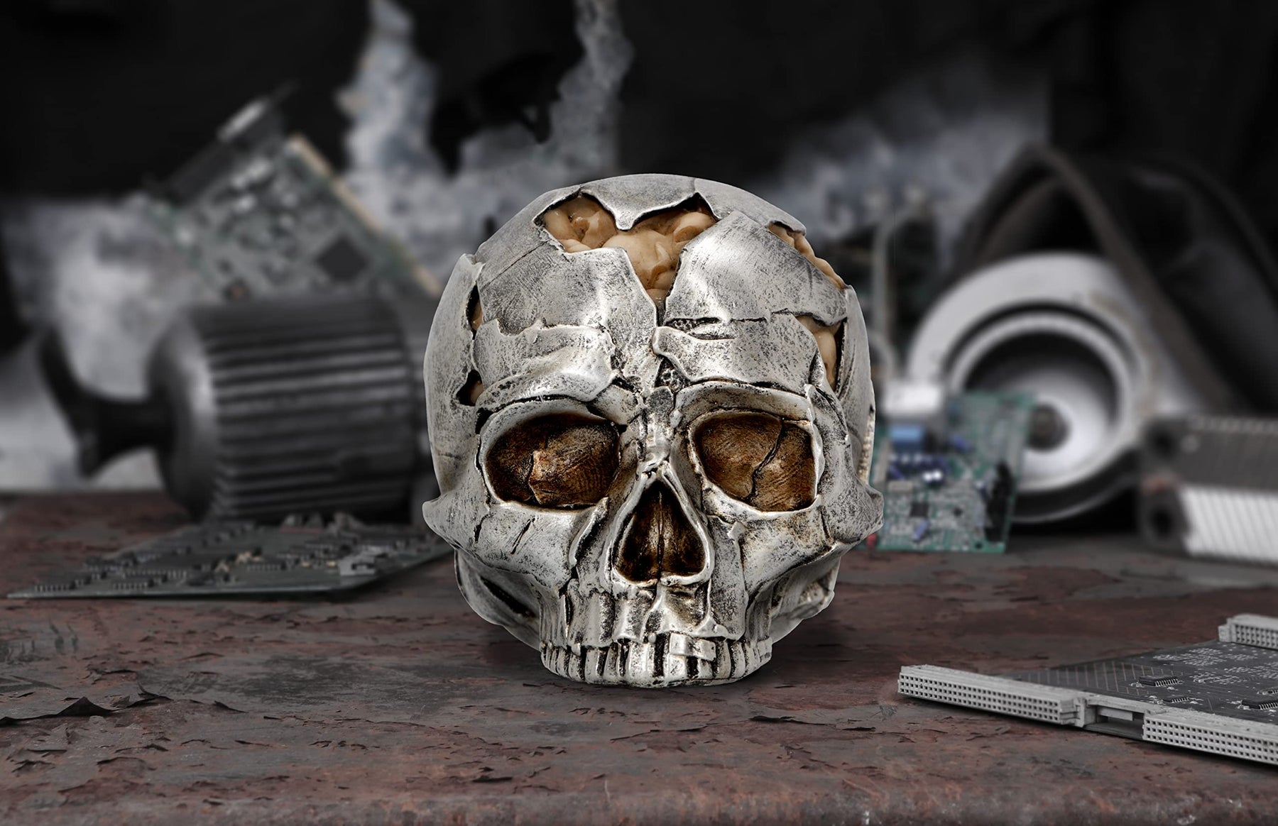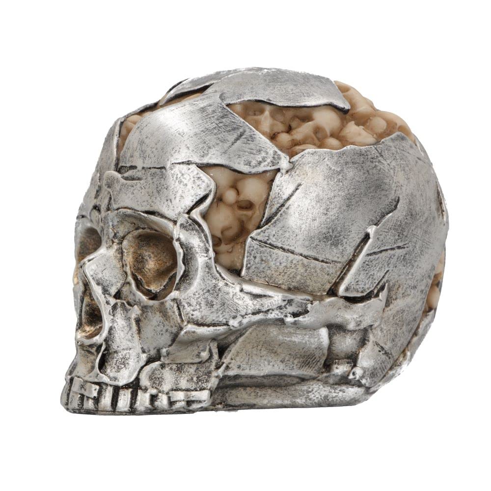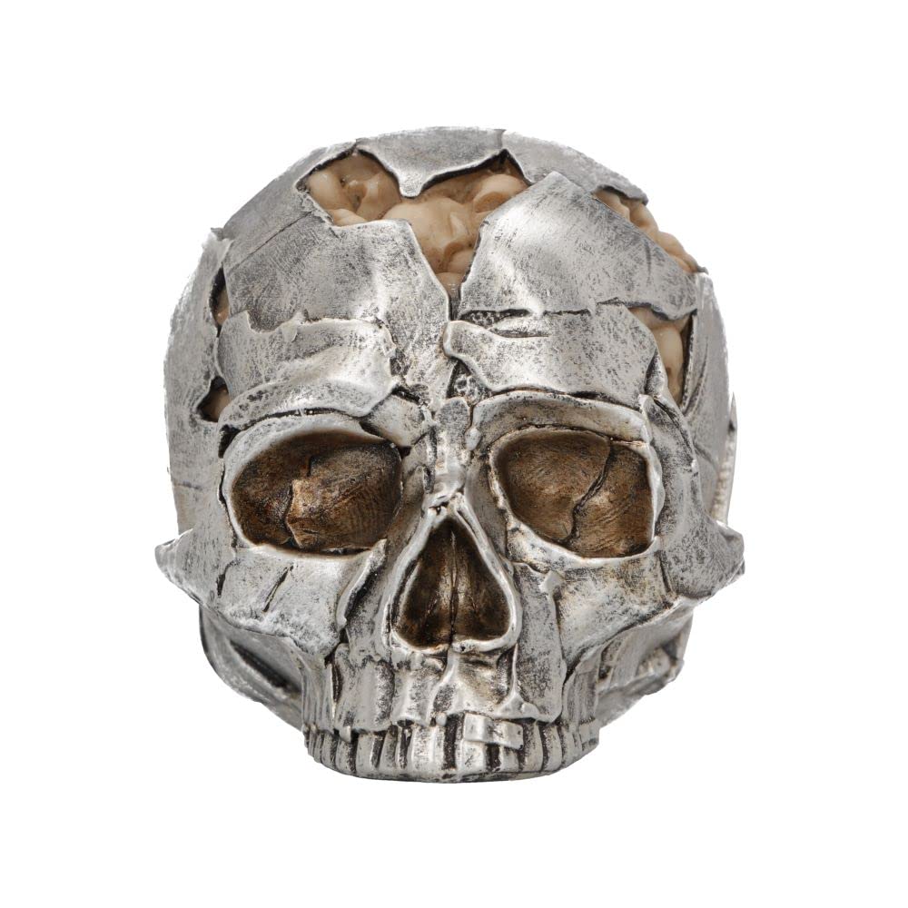 Introducing to you this small Fracture Skull. Formed out of shreds of metal, with smaller craniums appearing in the cracks which have formed on the crown of the skull, creating a brain effect. This unique piece has been cast in the finest resin before being expertly hand-painted and is the perfect addition to any alternative home or gothic collection.