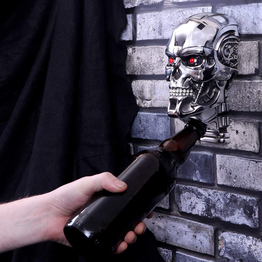 Sent back in time from the future, this officially licensed wall mounted bottle opener comes from alternative brand Nemesis Now's giftware selection. Staring straight ahead, this T-800 Terminator has shed all human flesh, exposed hydraulics overlaid on a metallic skeletal structure that mocks humanity. Red eyes stare menacingly. Beneath the Terminator's chin is the bottle opener, simply angle the bottle cap inside of the opening and pull it off. The T-800 won't even flinch. Cast in the finest resin before being carefully hand-painted, this wall mountable bottle opener will make a great addition to any classic sci-fi lover's collection.