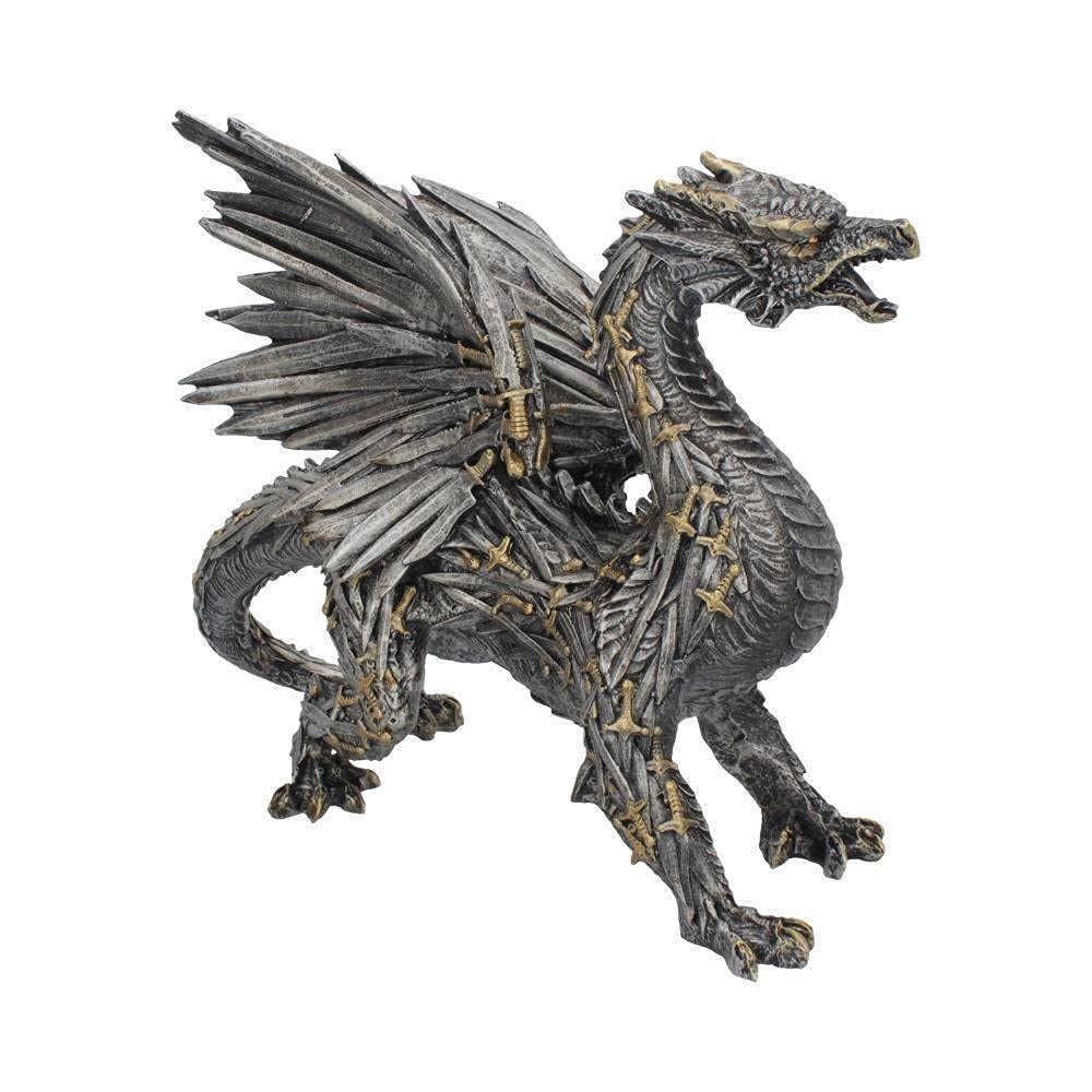 From alternative brand Nemesis Now, this piece is truly amazing. Golden handled swords cover the Dragon's body and tail, while scales on the legs and underbelly hint at a biological component. The wings are spread behind the beast and follow the sword theme. Cast in the finest resin before being expertly hand-painted, this piece would make the perfect centre piece for any alternative dining room.