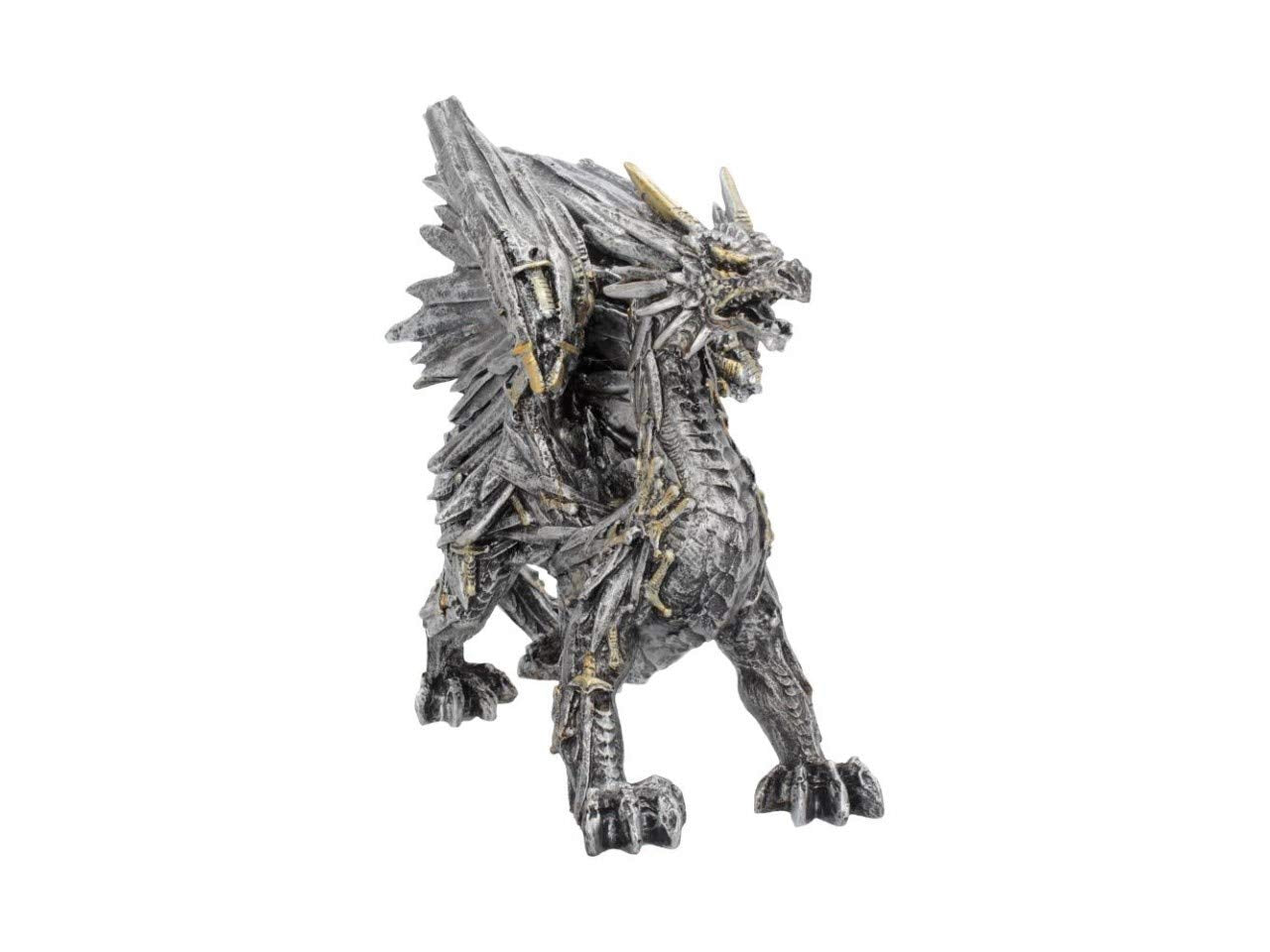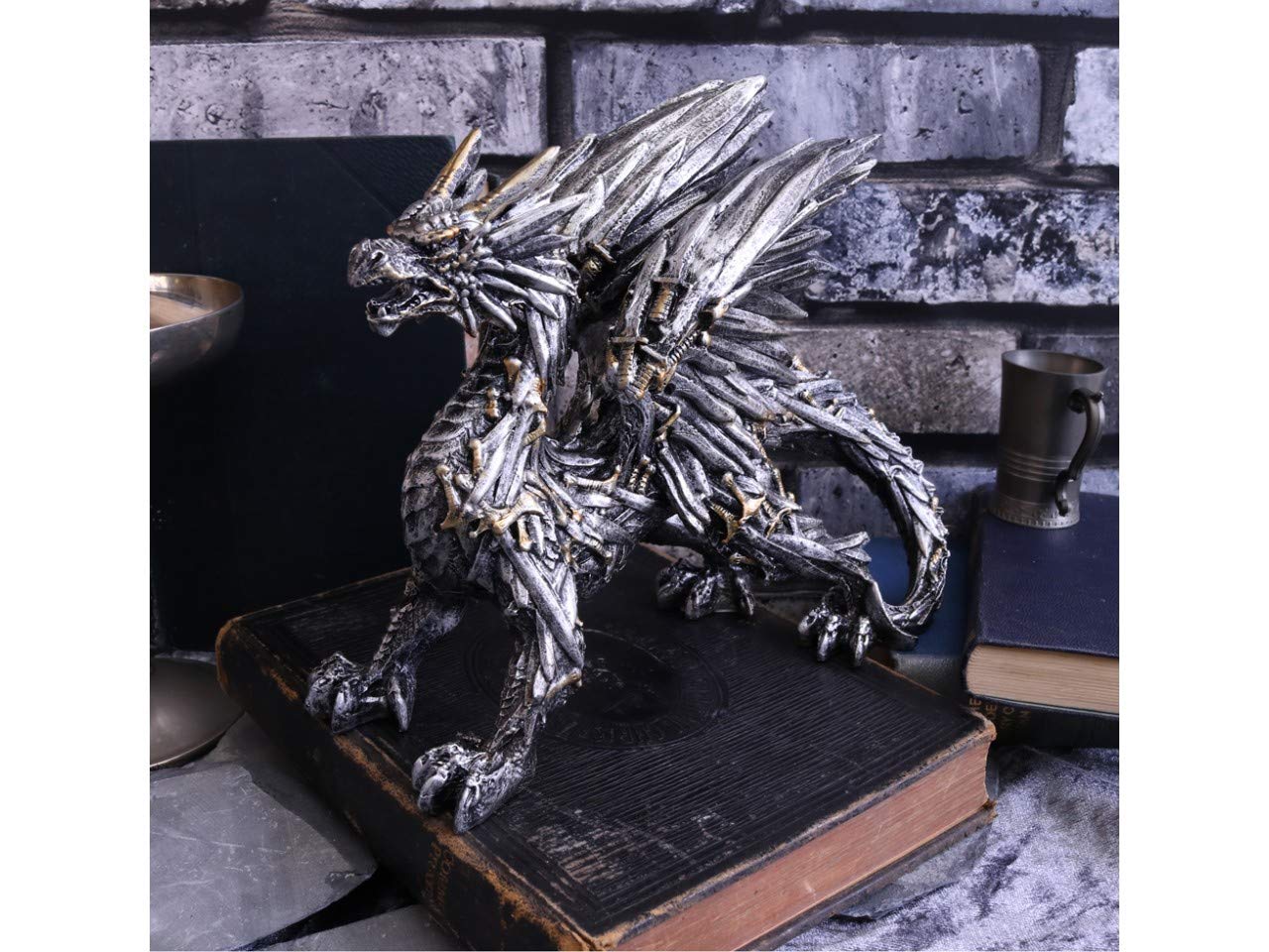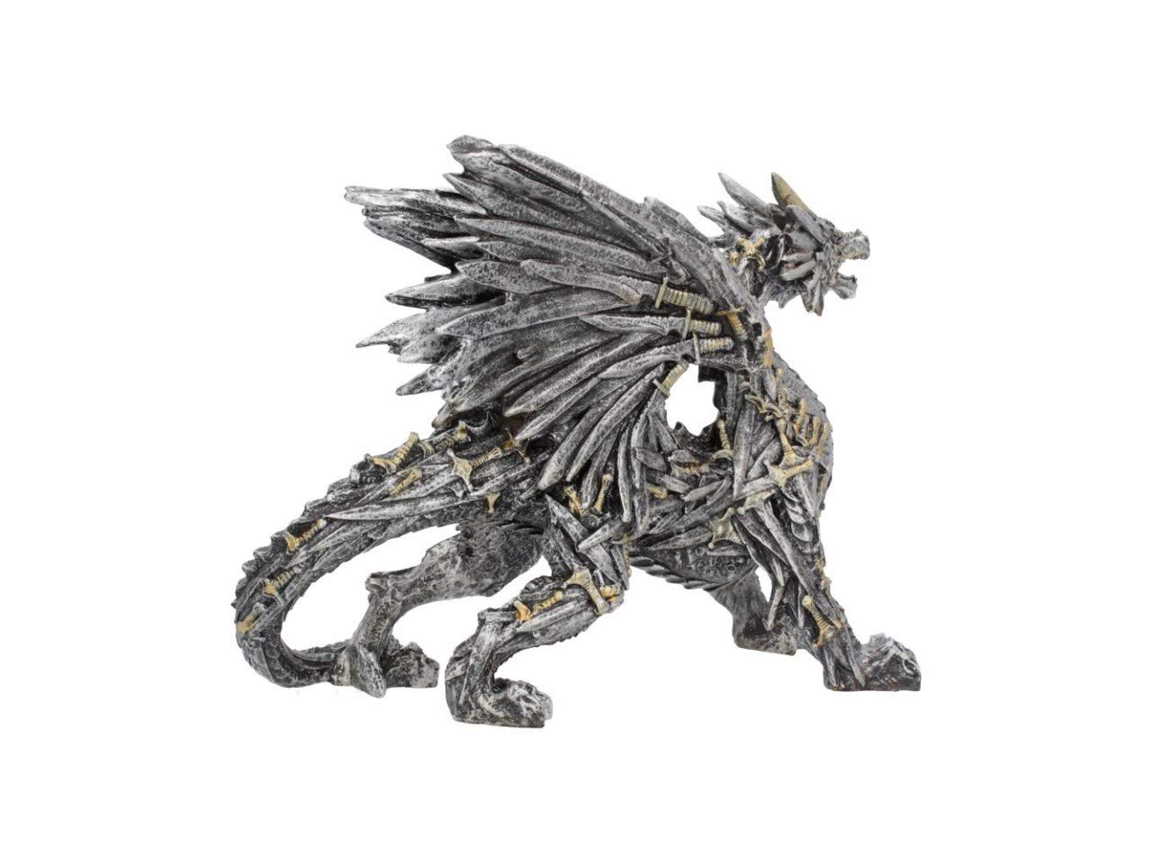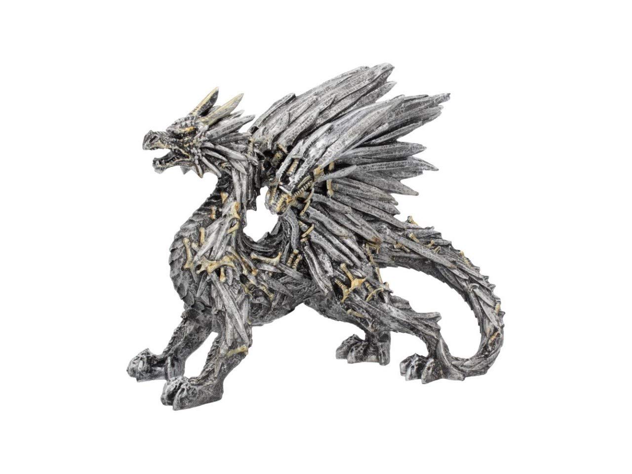 From alternative brand Nemesis Now, this piece is truly amazing. Golden handled swords cover the Dragon's body and tail, while scales on the legs and underbelly hint at a biological component. The wings are spread behind the beast and follow the sword theme. Cast in the finest resin before being expertly hand-painted, this piece would make the perfect centre piece for any alternative dining room.