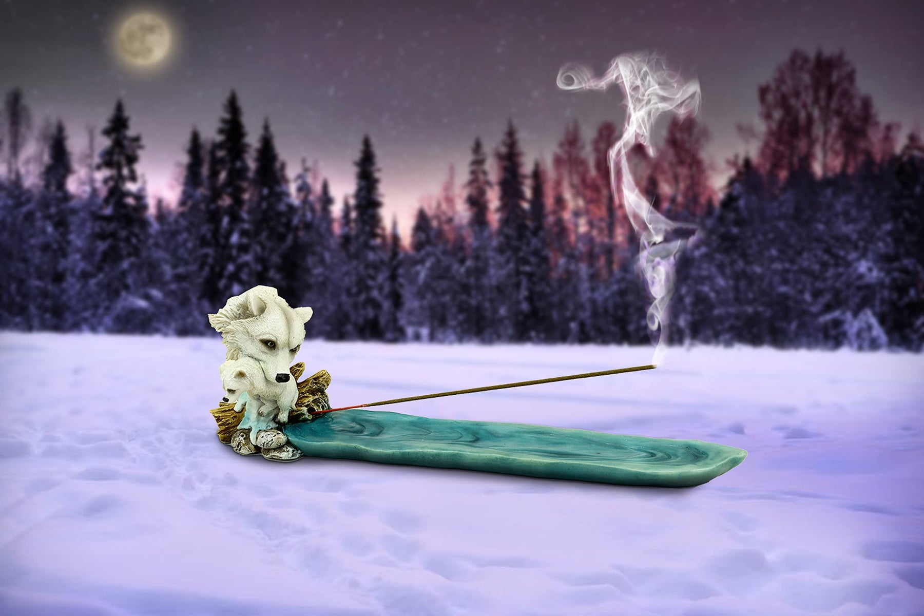 - Mother Wolf and Cub Incense Burner: The head of a white mother wolf holds her little cub in her mouth as she overlooks the flowing icy water