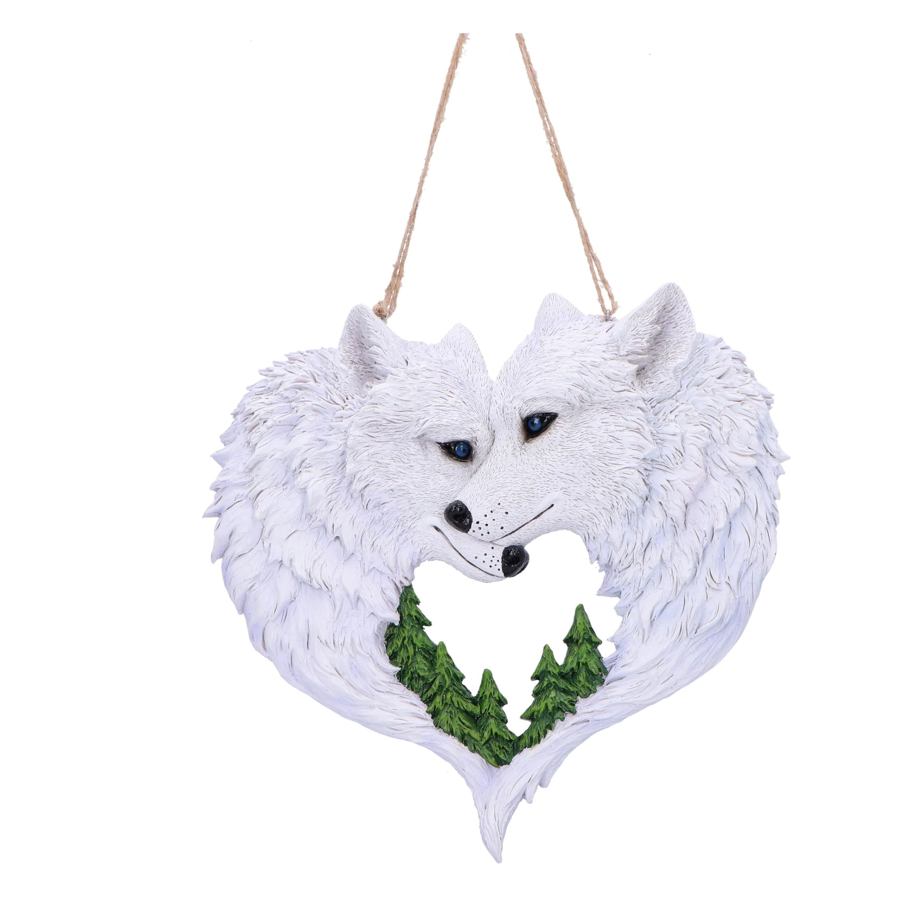 Capture the spirit of untamed beauty with our Snow in Love Wall Hanging Decoration from Nemesis Now's value collection. This exquisite piece features two wolves in a tender nuzzle, a heartwarming display of companionship and love. Suspended against a backdrop of a snow-covered forest, the evergreen pines create a serene scene that reflects the wolves' wild home. Painted in a pristine white hue with piercing blue eyes, these wolves epitomize the majestic nature of these creatures. Crafted from the finest resin and meticulously hand-painted. Ideal for animal lovers and those who appreciate the enchanting allure of wolves, it adds a touch of natural elegance to any space. As part of our extensive range of wolf-themed giftware, it stands as a symbol of the enduring bond between wildlife and those who admire its beauty. Whether your customers are collectors or seeking a thoughtful gift, the Wolf Wall Hanging Decoration brings a touch of the wilderness to your surroundings.