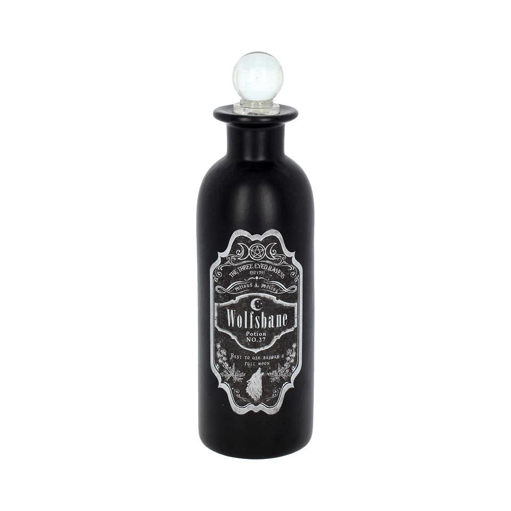 This unusual bottle from Nemesis Now looks as though it has just been taken from an apothecary. Predominantly black, this bottle features an aged 'label' that reads 'The Three Eyed Ravens, Potions & Poisons, Wolfsbane Potion No.27, Best to use before a Full Moon'. Above the writing there is an emblem of a pentagram, surrounded by the sign of the Triple Moon. This the perfect gift for those who embrace their dark side.