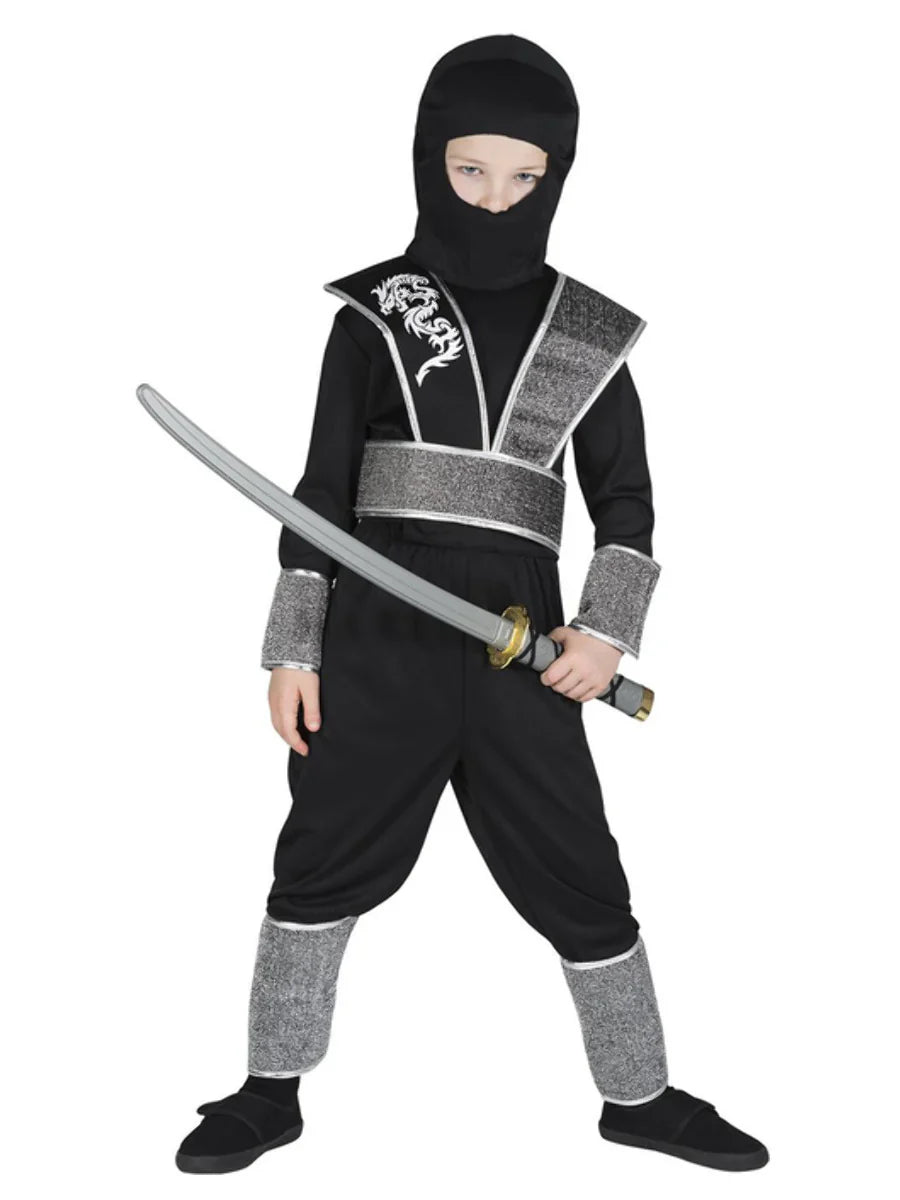 Unleash your child's inner warrior with this Ninja Boy Costume! This action-packed ensemble includes a sleek black top and matching trousers, a mysterious face mask, a detailed tabard, and coordinating arm and leg cuffs for the ultimate stealthy look. Perfect for Halloween, costume parties, and ninja-themed play, this Ninja Boy outfit ensures comfort and mobility for epic adventures.