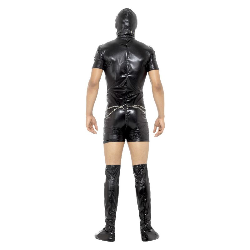 This hilarious Bondage Gimp Costume is sure to get heads turning! This brilliant outfit comes complete with a black shiny short bodysuit (made to look like latex) with Cut Out Nipple Patches, Black Hood with Eye Holes, Black Bootcovers, Mesh Thong with Silver Chain, Black Gag and Silver Nipple Clamps to finish off the outfit.